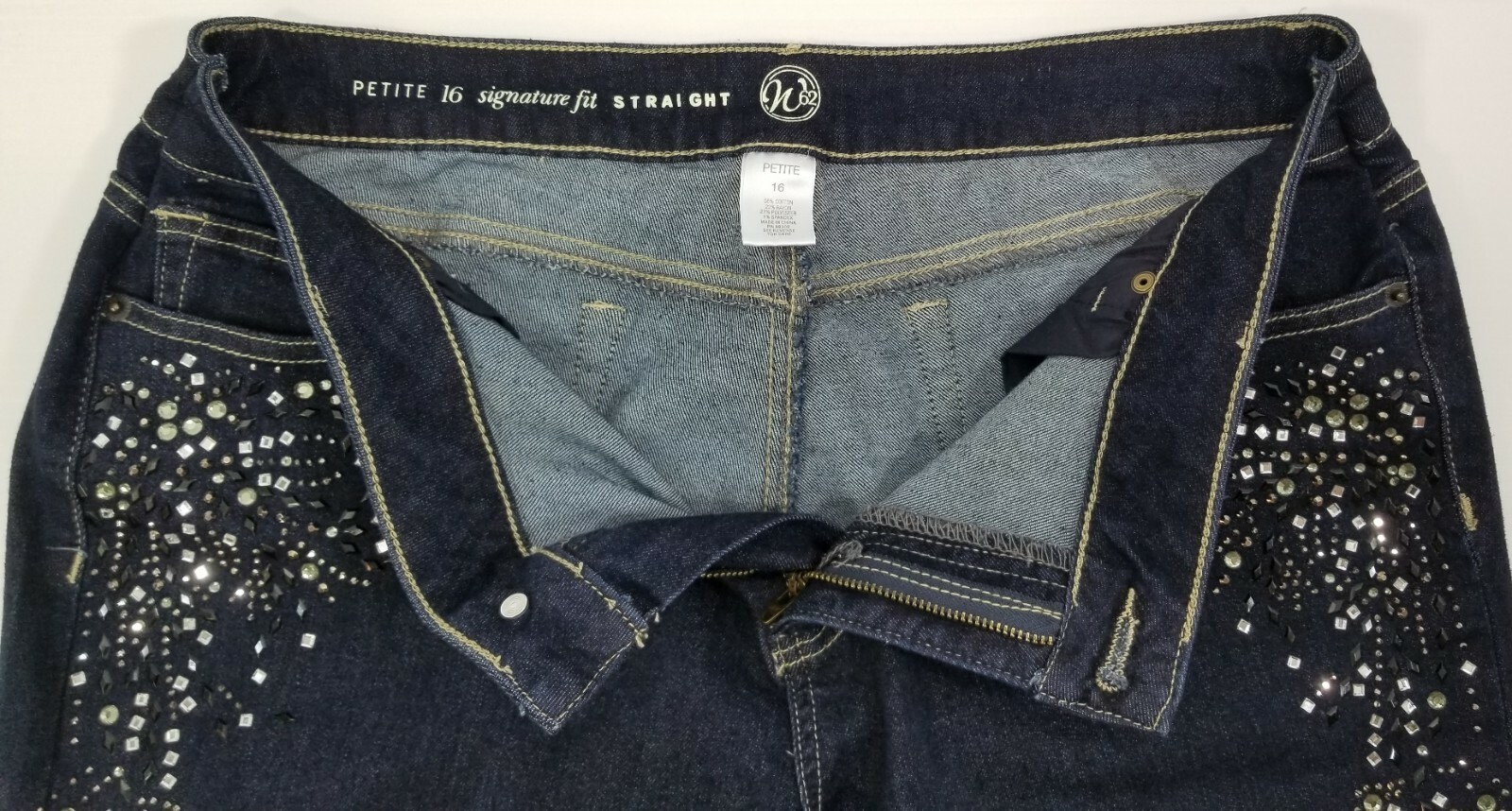 N62 Women Petite 16 Signature Fit Straight Sparkly Studded Denim Blue Jeans