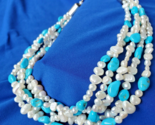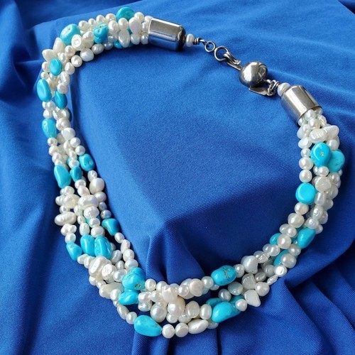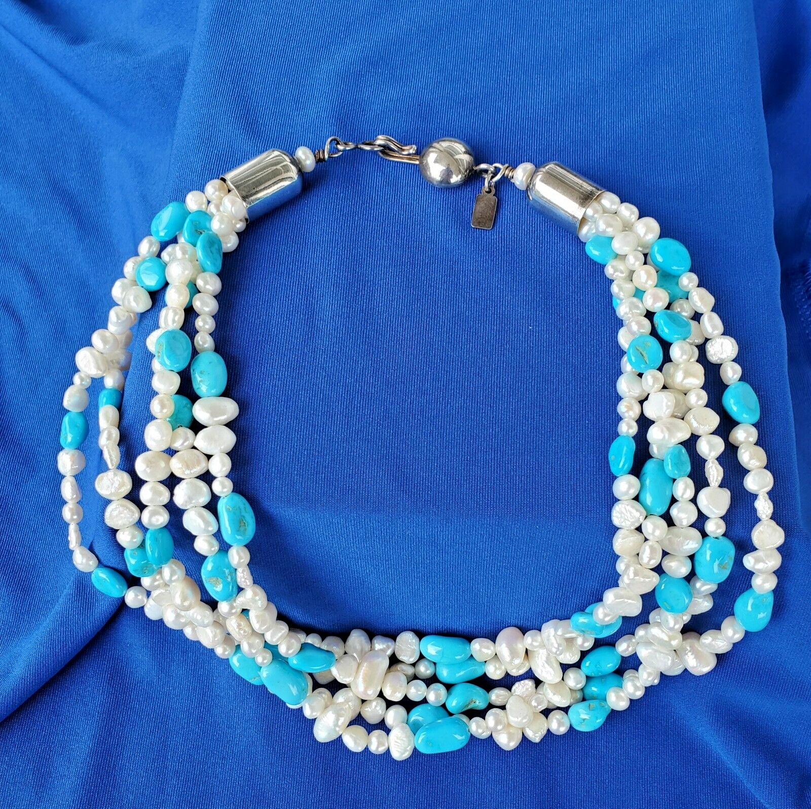 VINTAGE NATIVE NAVAJO TURQUOISE PEARL MULTI STRAND STERLING SILVER NECKLACE.