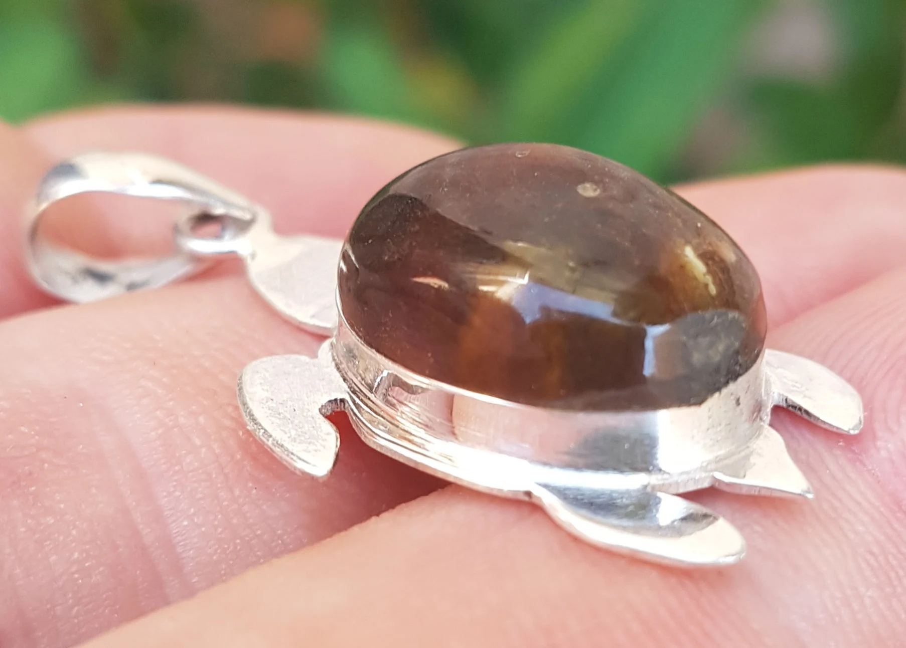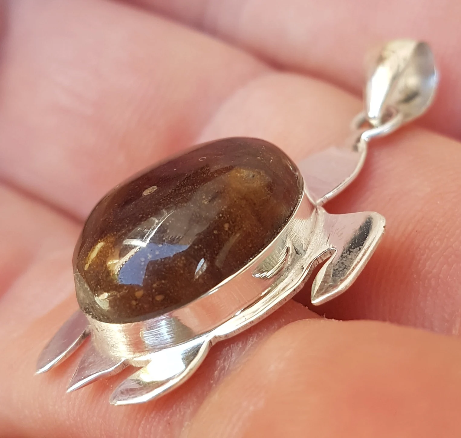- NATURAL AMBER handcarved Gemstone 925 sterling silver TURTLE pendant (man-5)