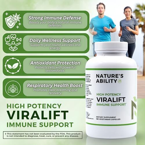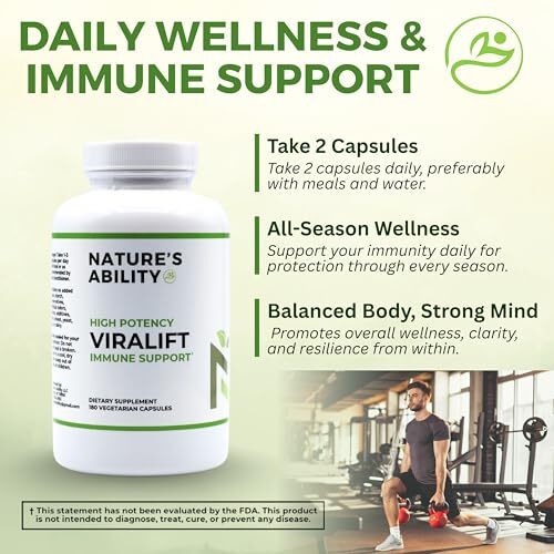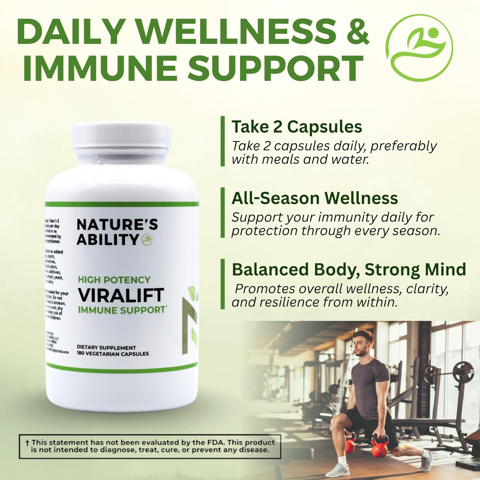 Bullet point: Advanced Immune Support Formula: Strengthen your body?s natural defenses with Nature?s Ability Viralift, a high-potency immune support supplement made for adults. Each serving delivers a synergistic blend of Olive Leaf Extract, Monolaurin, and herbal roots that work together to help maintain immune balance, promote healthy response, and support overall wellness throughout the year.