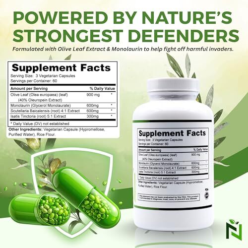Product description: Nature?s Ability Viralift High Potency Immune Support is a premium immune system booster for adults, formulated to strengthen your body?s natural defenses year-round. Each serving combines 900 mg of Olive Leaf Extract (40% Oleuropein) with Monolaurin, Scutellaria Baicalensis, and Isatis Tinctoria?a synergistic herbal complex known for its immune, antioxidant, and respiratory support properties. Viralift is designed for those seeking a clean, plant-based formula free from artificial additives. Crafted in a GMP-certified facility, this supplement ensures top-tier quality and effectiveness in every capsule. Support your wellness and resilience naturally with Nature?s Ability Viralift?your daily immune ally.