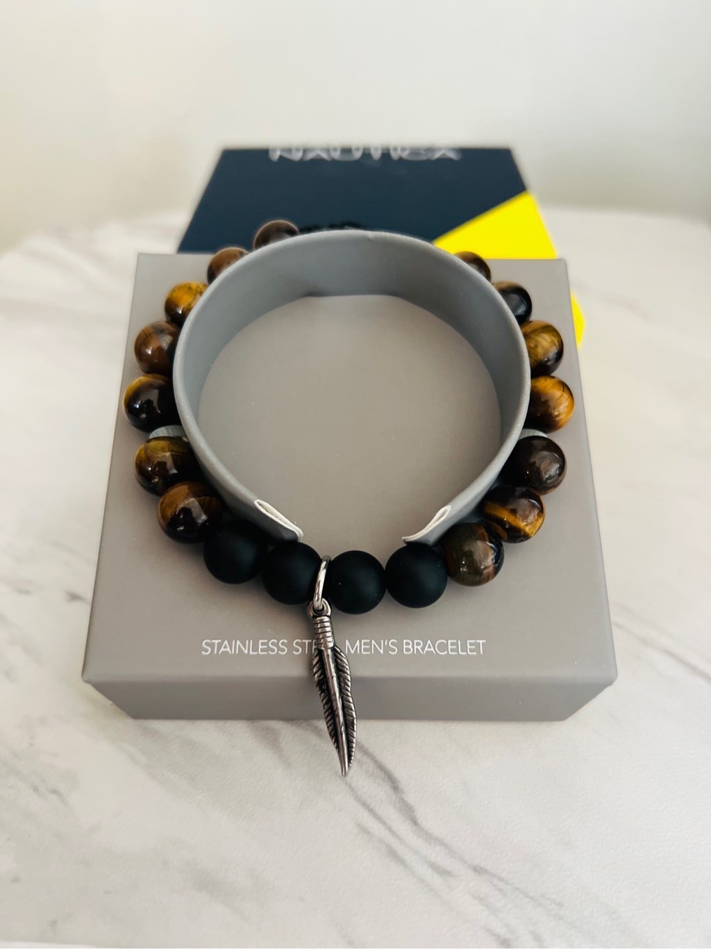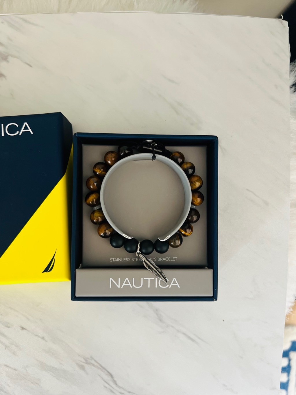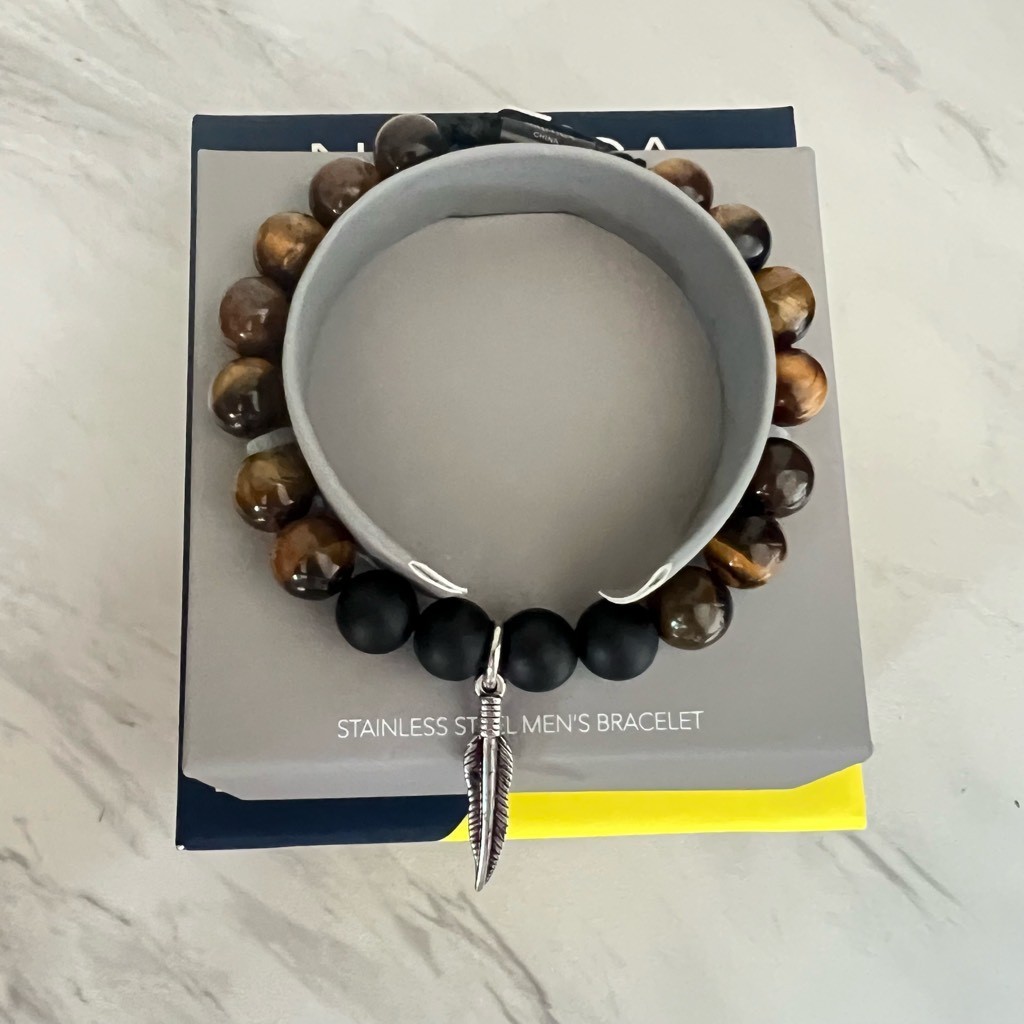 - NAUTICA Tiger Eye Beaded Feather Charm Bracelet, Uni Sex, Brown/Black, NWT
