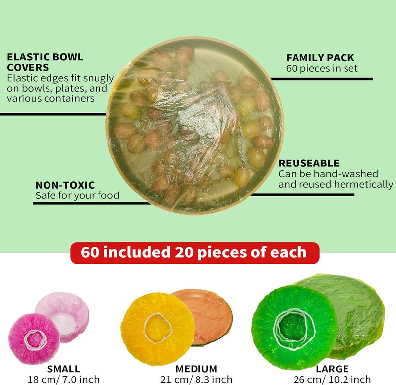 Versatile Sizes and Colors: Available in 60 pcs and three distinct sizes and colors?pink (S, 5.9 in/15 cm), yellow (M 8.3 in/21 cm), and green (L 10.6 in/27 cm).These covers are designed to fit a wide range of bowls, dishes, and plates, accommodating nearly any container you might use.