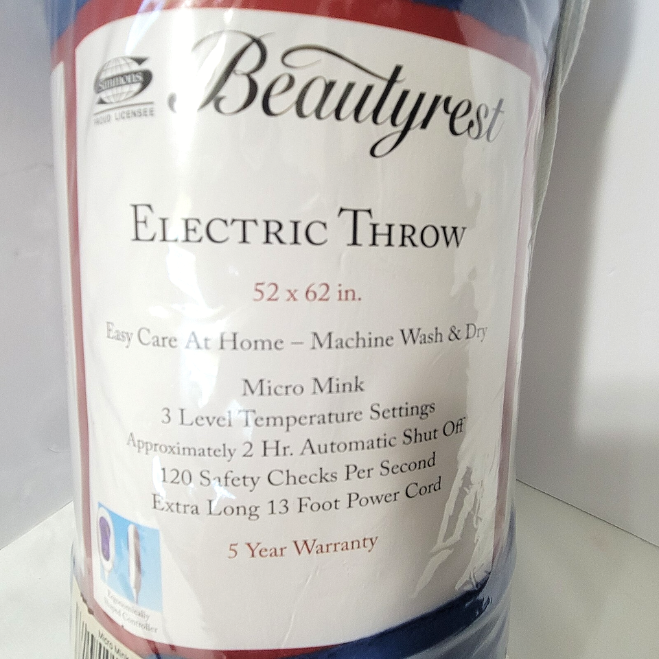 New in packaging, Beautyrest Electric Throw measures 52" x 62", soft micro mink in royal blue