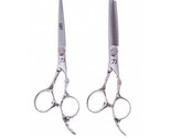 Product description: High quality, high carbon Japanese 440C stainless steel, 5.5 or 6.0 inch professional cutting shear matching 30 tooth thinner, designed for optimal comfort and efficiency with an offset handle, unique rose engravings with floral tension stone, and a permanent finger rest.