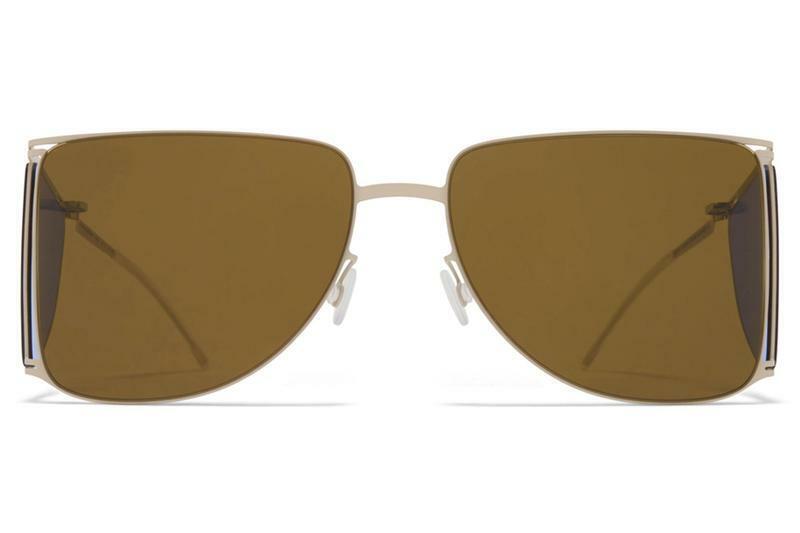 This is a great pair of brand new, never worn, in original box with cleaning cloth and carrying case Helmut Lang x Mykita Sunglasses. Brown lenses with blue side panels, warm gray (light silverish) metal frame. Style HL002.