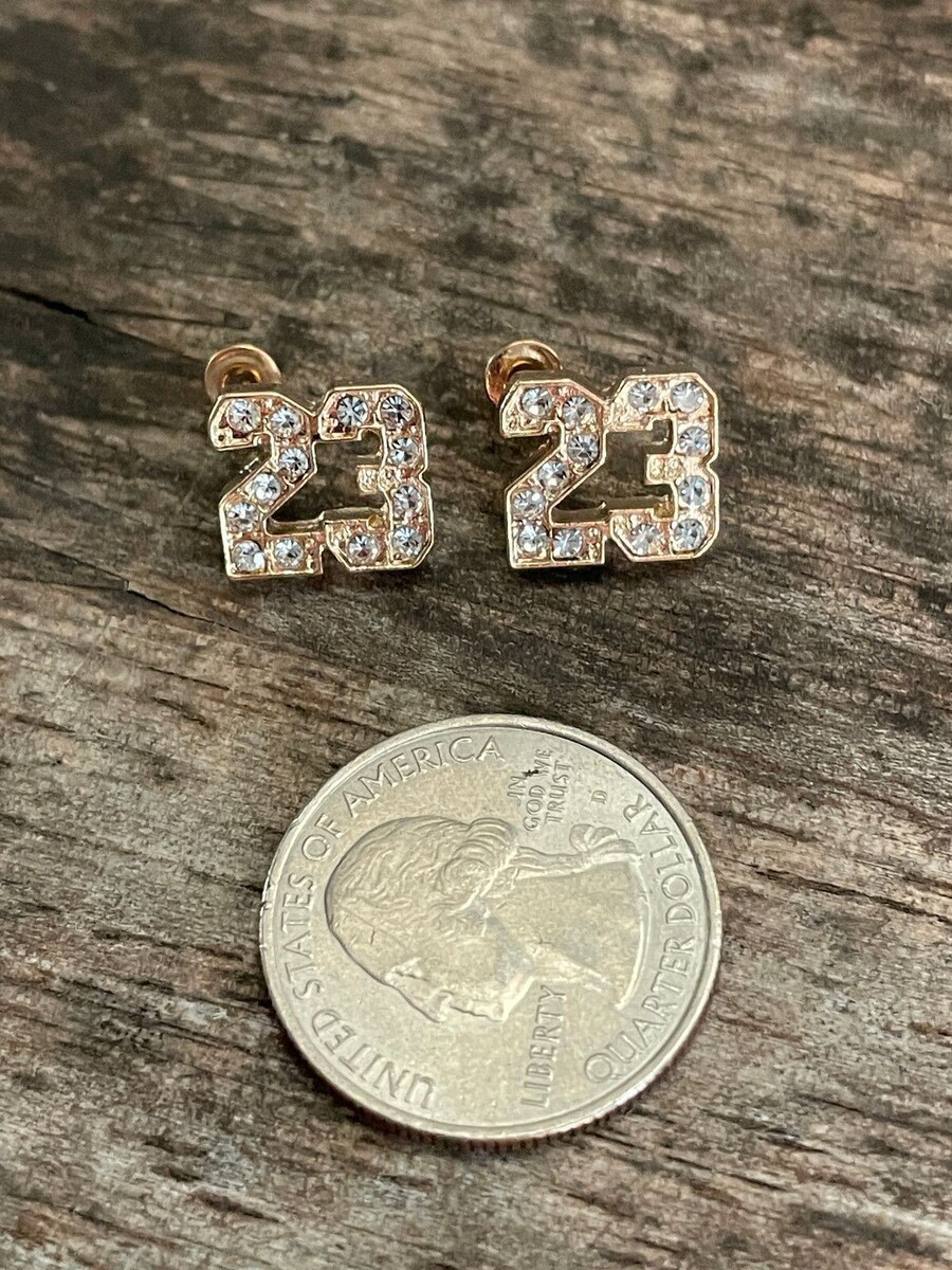 Pierced stud earrings in the shape of number "23," the number of NBA great Michael Jordan, adored with clear European crystal rhinestones