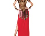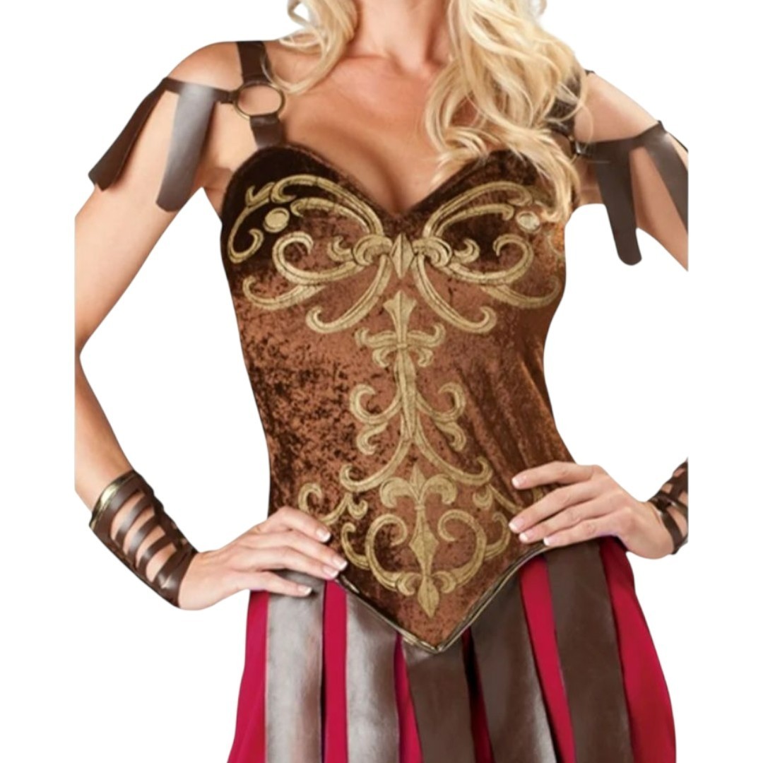 You'll be the sexiest gladiator the Romans have ever known in the Gorgeous Gladiator Adult Costume for Women. This ensemble features a gladiator inspired top with a flash of red. The top of the Gorgeous Gladiator Halloween costume has a sweet heart neckline, putting your curvaceous bosom on display. The bodice of the ensemble is a brown velvet style top adorned with gold accents. Along the hemline of the top are faux leather vertical straps with gold accents. The straps of the top are brown faux leather connected with O rings with shoulder accents. The bottom of the ensemble is a floor-length red skirt with a side thigh slit. Included with the Gladiator dress are wrist cuffs to give your that real roman look. Costume includes: Dress with printed armor and cuffs.
