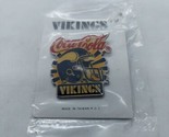 The product is an officially licensed NFL Minnesota Vikings Coca Cola Helmet Pin. It features the Minnesota Vikings team logo on a helmet design, with a multi-color Coca Cola branding. This unisex adult pin is one size and perfect for football fans who support the Minnesota Vikings. Made in the United States.