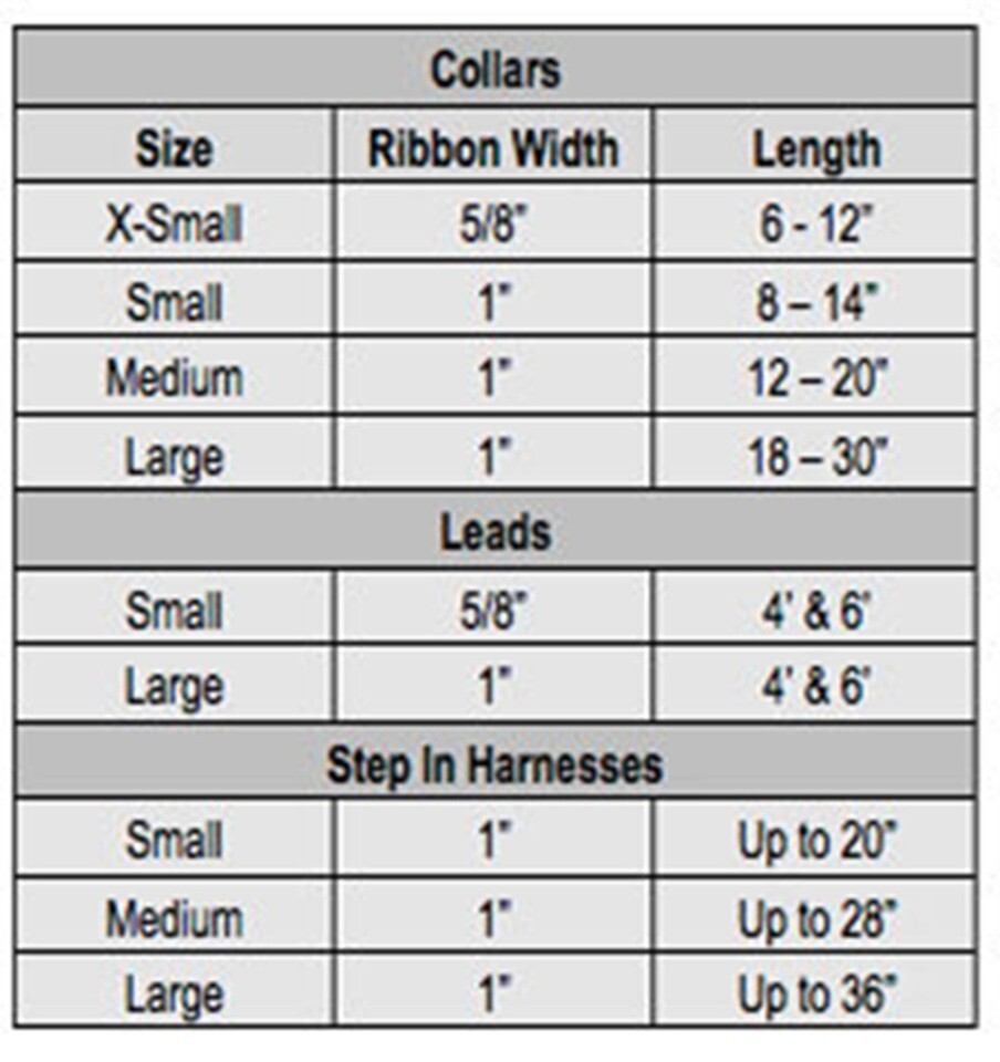 Size Chart for Harness: Small: Ribbon Width of 1"; Length up to 20" --- Medium: Ribbon Width of 1"; Length up to 28" --- Large: Ribbon Width of 1"; Length up to 36"