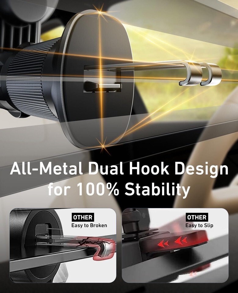 NIYEVN car vent cell phone holder is exquisitely crafted, the hooks are made of metal material, double hook design, Durable long-lasting. A stable triangular structure is formed between the hooks of the car cell phone holder and the car air vents, rock solid and unbreakable, suitable for most horizontal and vertical vents. Note: Not applicable to round vents.