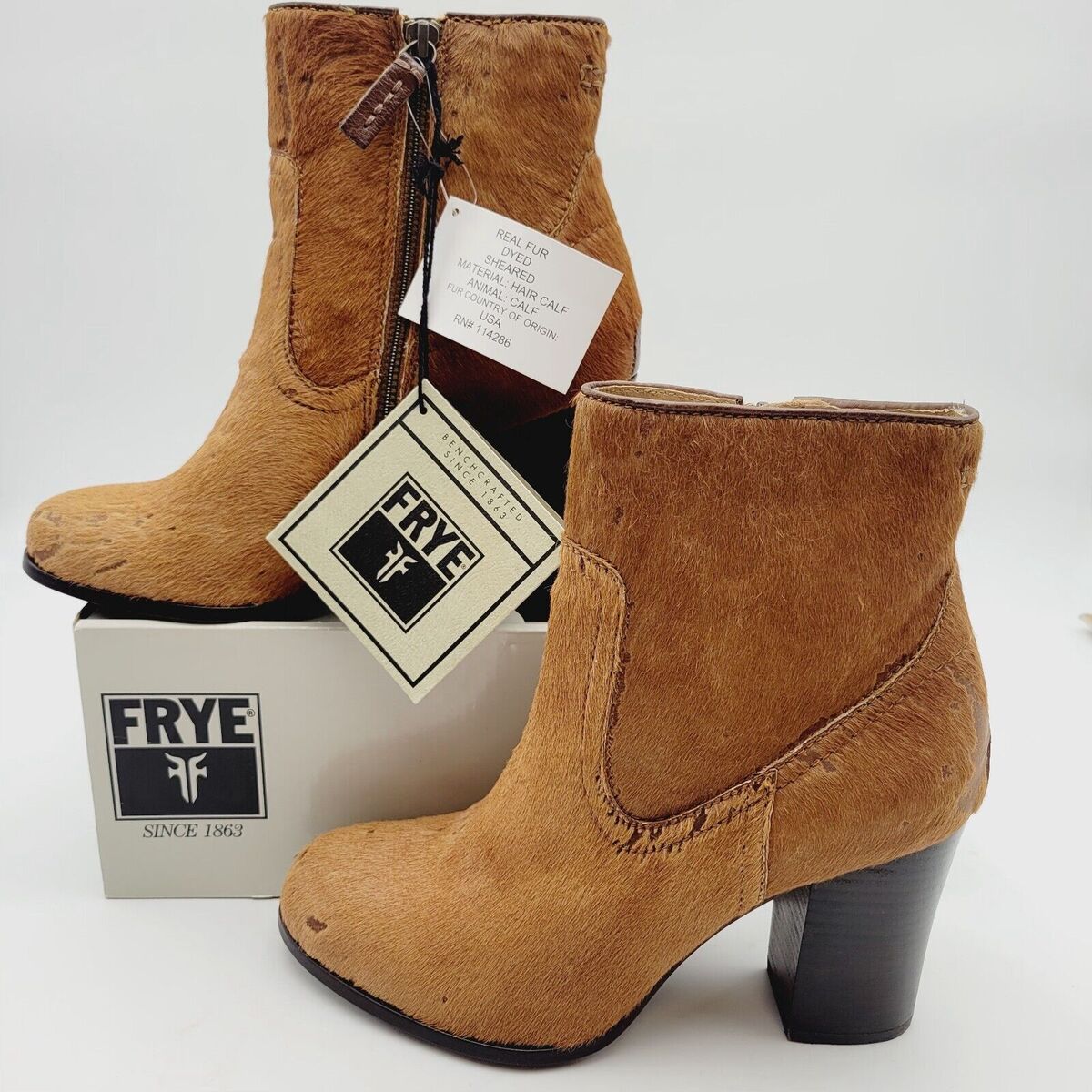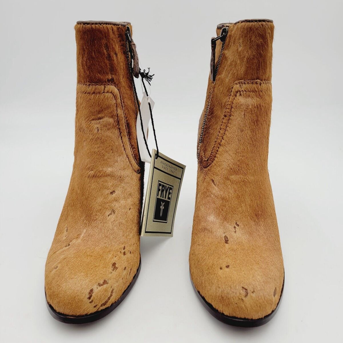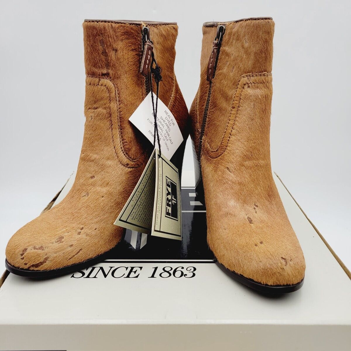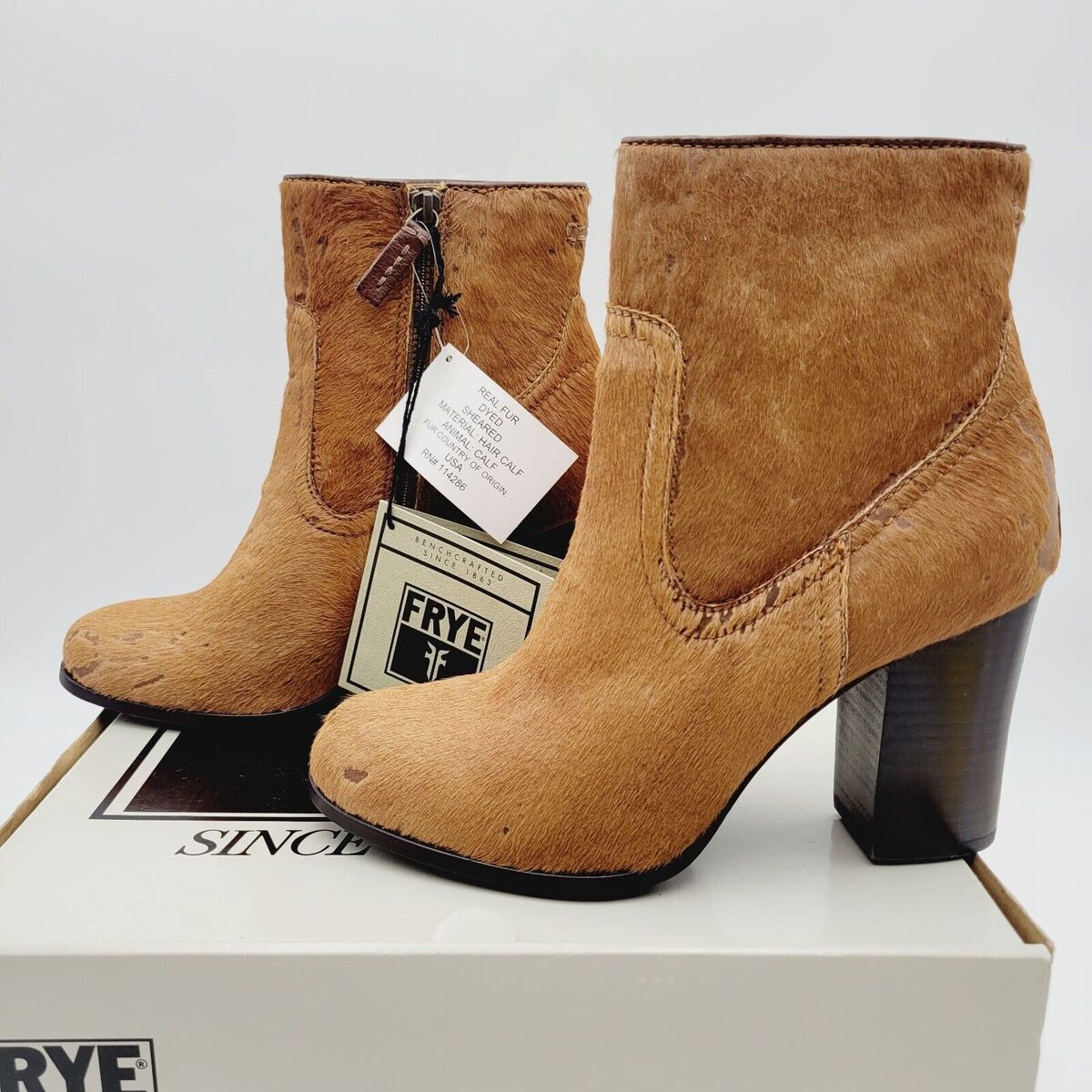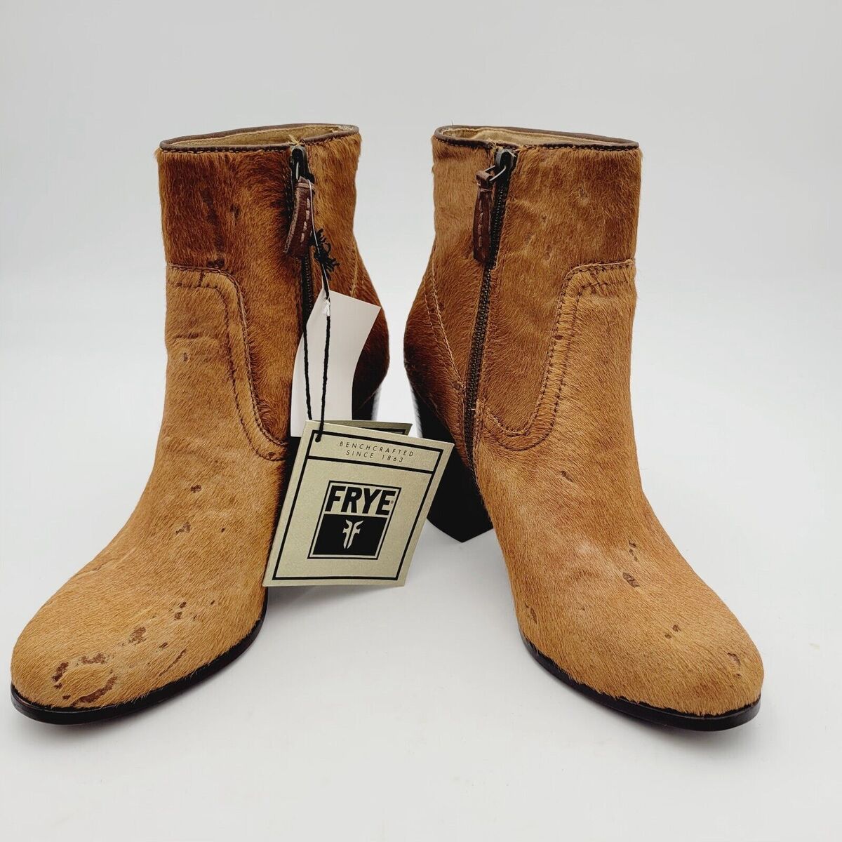 The product is a pair of Frye Parker Short Harcltfg boots for women in cognac color, size 9.5 medium (M). They have a high block heel of 3 inches or more and are made of leather. The boots have a bootie style and a B shoe width. They are new with box and have not been modified.