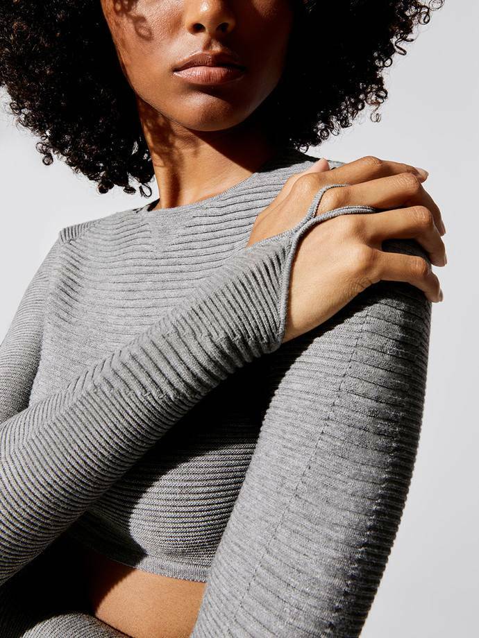 This is a great Adam Selman Sport shrug. The ribbed knit sweater-like material top (100% nylon) in Gray with crewneck and finger loops. Brand new with tags. $225 retail