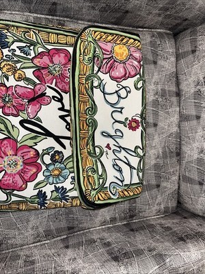 The NWT Brighton D30258 Love Is In The Air Floral Canvas Tote Bag is a large, square-shaped tote bag with multicolor handles and accents. The exterior features a colorful floral pattern with a heart motif, perfect for occasions such as travel, casual outings, or workwear. This stylish tote from the Brighton Queen of Love collection is a vibrant and eye-catching accessory for any woman's wardrobe.