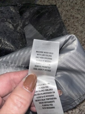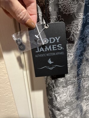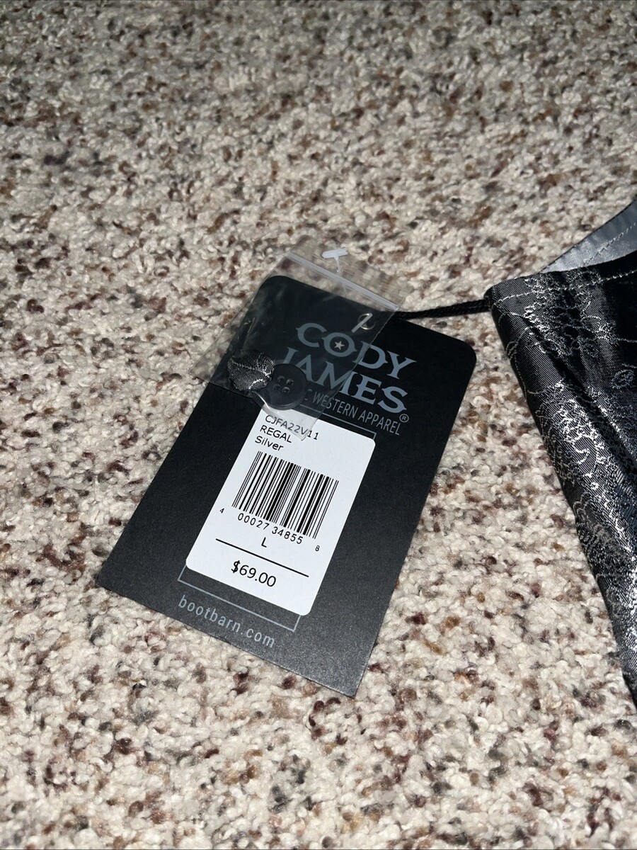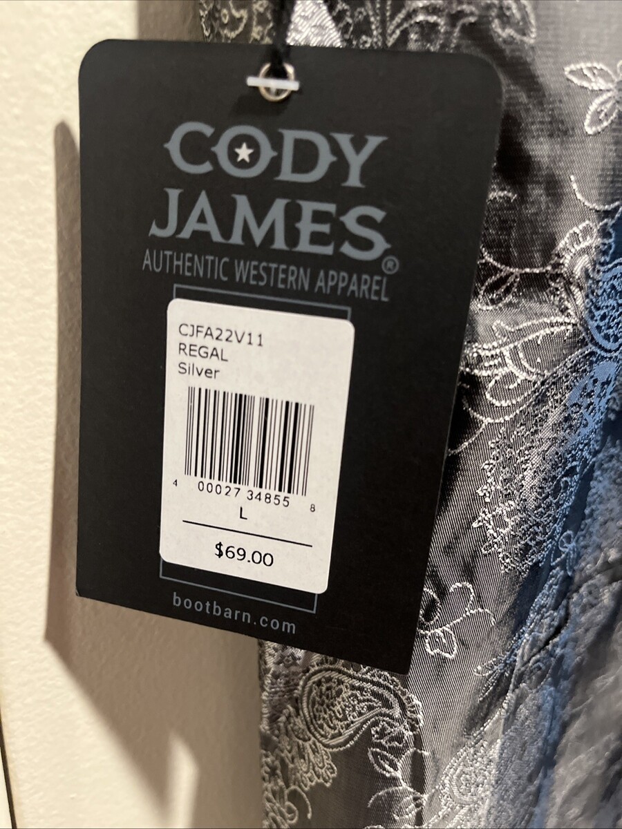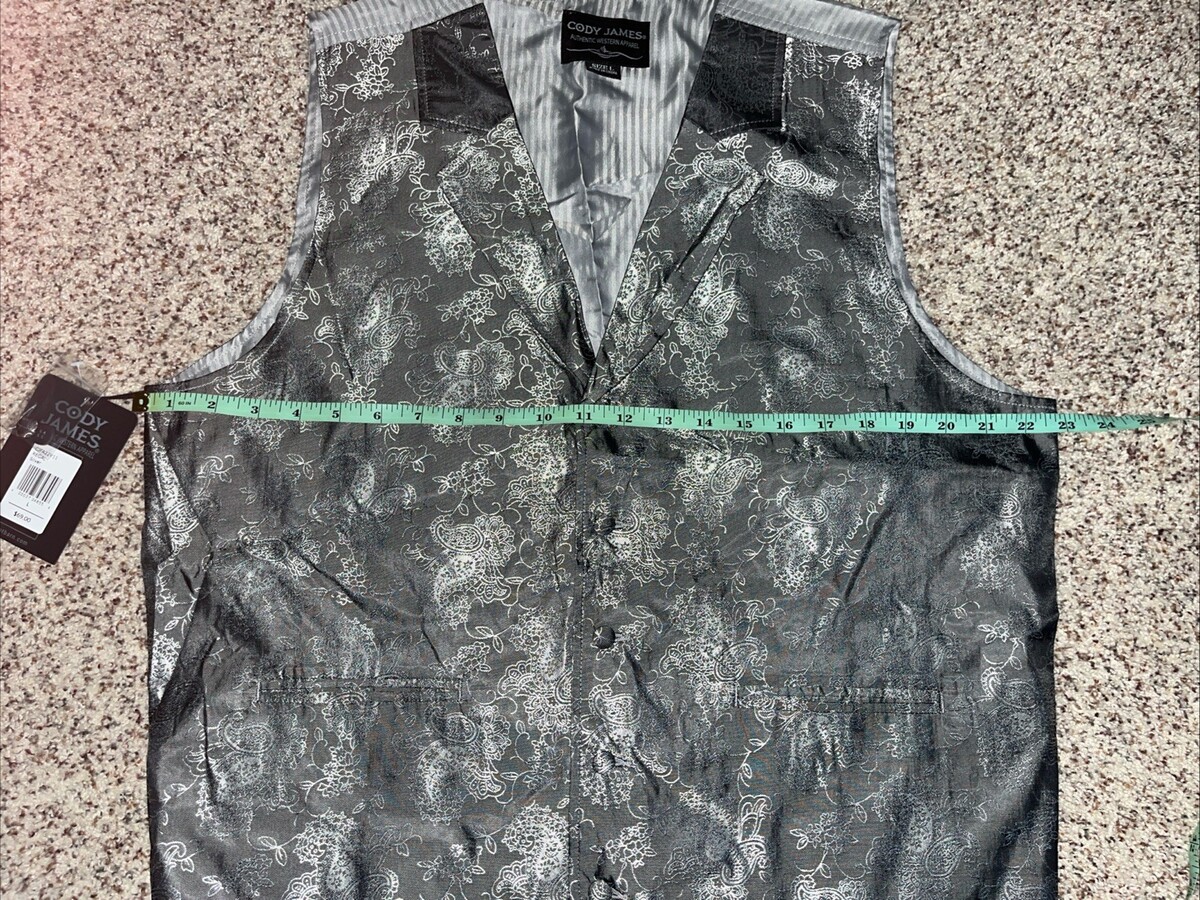 The NWT Cody James Gray Silver Paisley Print Western Rockabilly Dressy Formal Vest in size L is a stylish and elegant piece perfect for formal occasions. Made from a blend of polyester and rayon, the vest features a button closure, paisley pattern, and matching covered buttons. The gray and silver color combination adds a touch of sophistication, making it suitable for parties, cocktails, or any dressy event. With its Western wear design and accents like pockets, this vest from Cody James offers a classic and versatile addition to any man's wardrobe.