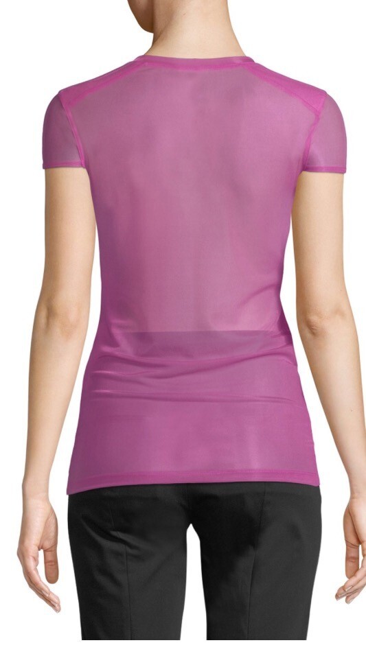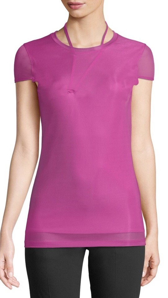 This is a great Helmut Lang top as seen by Shayne Oliver from the current season collection. The Pulled Tee in fuchsia organza silk features a drawstring that loops through the front of the top and can be worn in numerous ways. Brand new with $310 retail tags