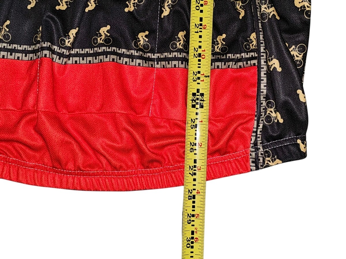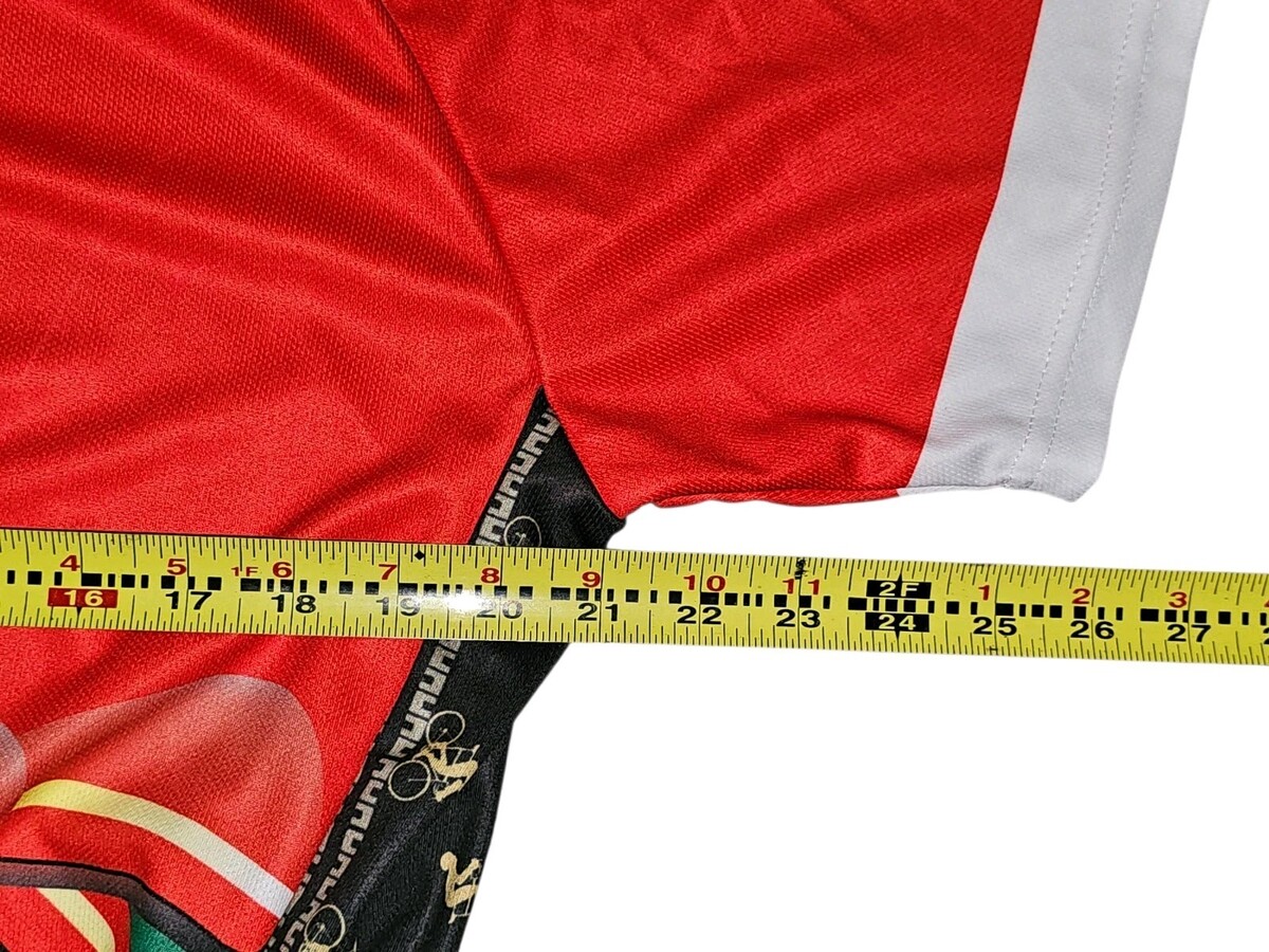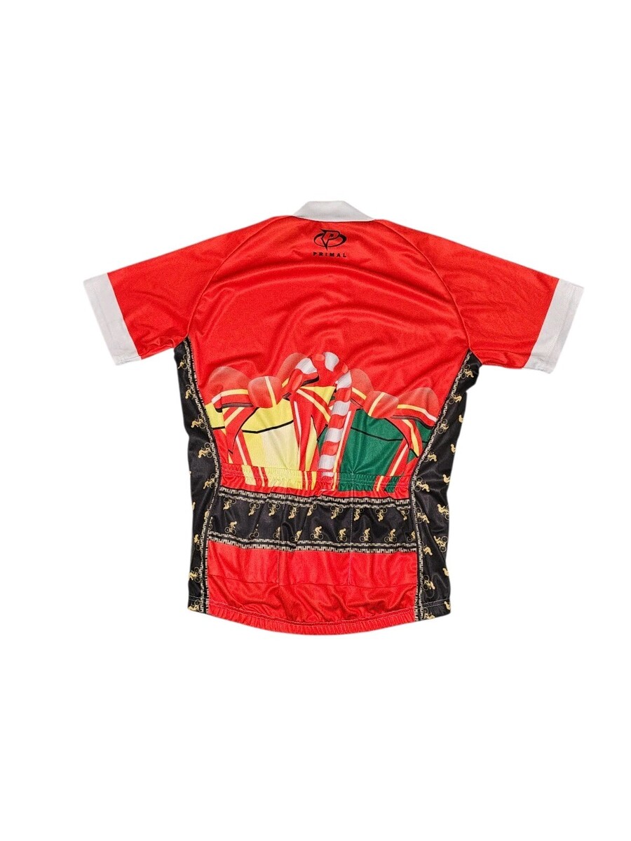 The NWT Primal Cycling Jersey is a limited edition Santa suit-themed cycling top in size XXL. This full zip jersey features a high neckline, band collar, and a graphic print of Santa Claus. Made of lightweight and breathable polyester material, it is designed for comfort and moisture-wicking during cycling in the spring and summer seasons. With a relaxed fit and athletic style, this jersey is perfect for a festive holiday ride or a casual outing. The jersey also includes pockets for convenience and is machine washable for easy care.