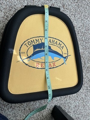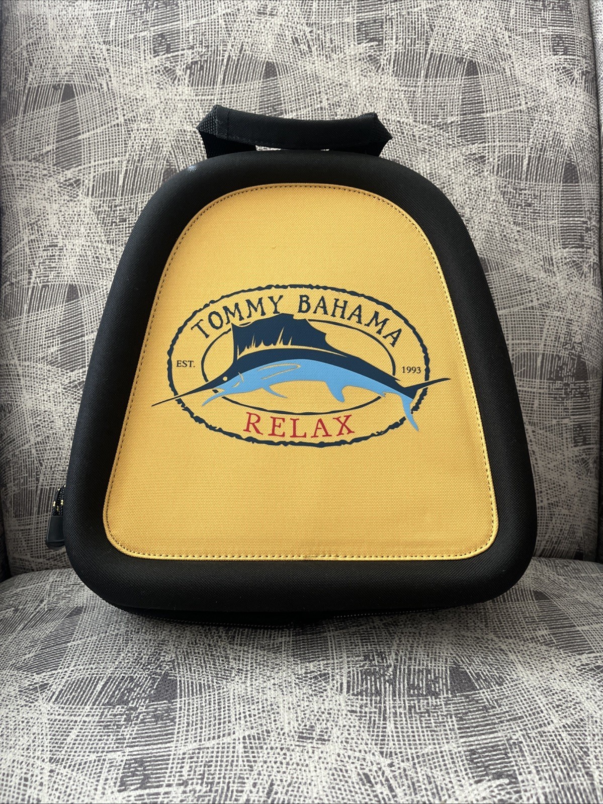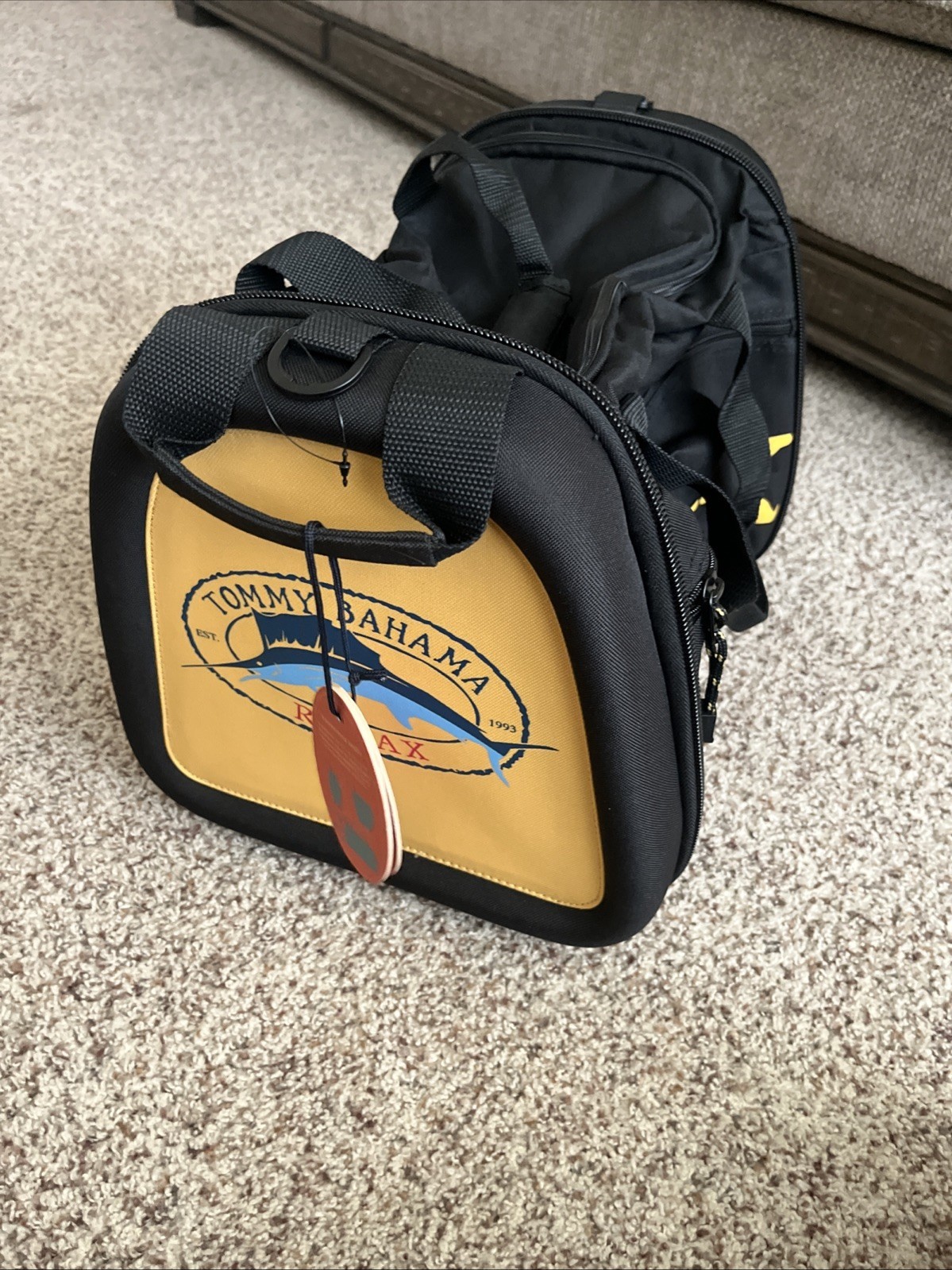 This NWT Tommy Bahama hard-sided duffle bag in black is a stylish and functional travel accessory. With a solid pattern and zip closure, this medium-sized bag features double handles and is collapsible for easy storage. Made from canvas/nylon/plastic material, the bag is designed for casual occasions and comes in a bold Tommy Bahama Marlin theme.