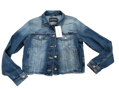 - NWT Women's Calvin Klein Sz Medium Denim Jacket STRETCH Frayed Hem New With Tags