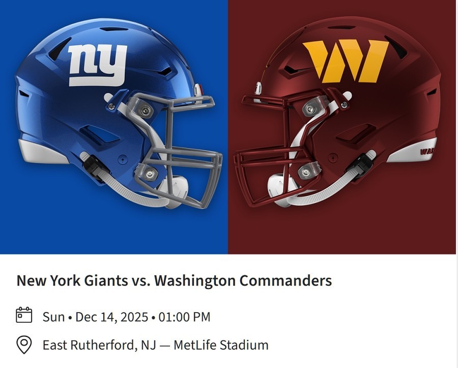 NY Giants vs Washigton Commanders - Dec 1 4 (Sun) - 100 Level Seats (2 Tixs)