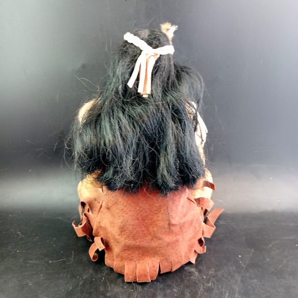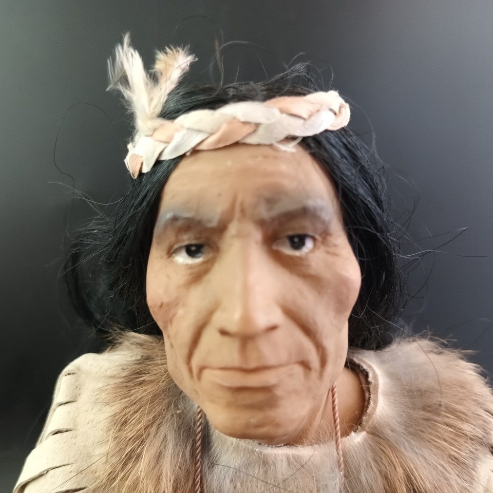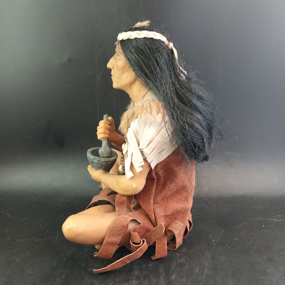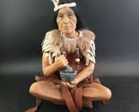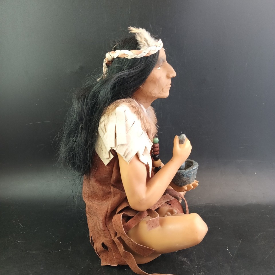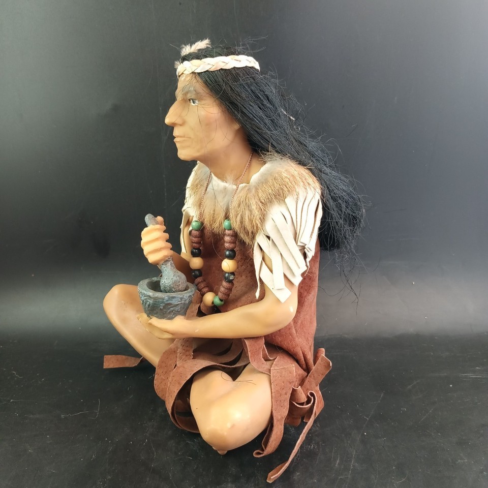 "This Native American Elder Grinding Medicine Resin Figurine is a beautifully crafted piece depicting a Medicine Man, showcasing intricate carvings and hand-painted details in a matte finish. The ceramic figurine, measuring 8 inches in height, is a medium-sized collectible suitable for any room in the house. Its authentic design and colorful multicolor paint make it a unique and decorative addition, perfect for those interested in Native American art and culture. Made in the United States in the late 20th century, this figurine comes unboxed and is a standout piece for any collection."