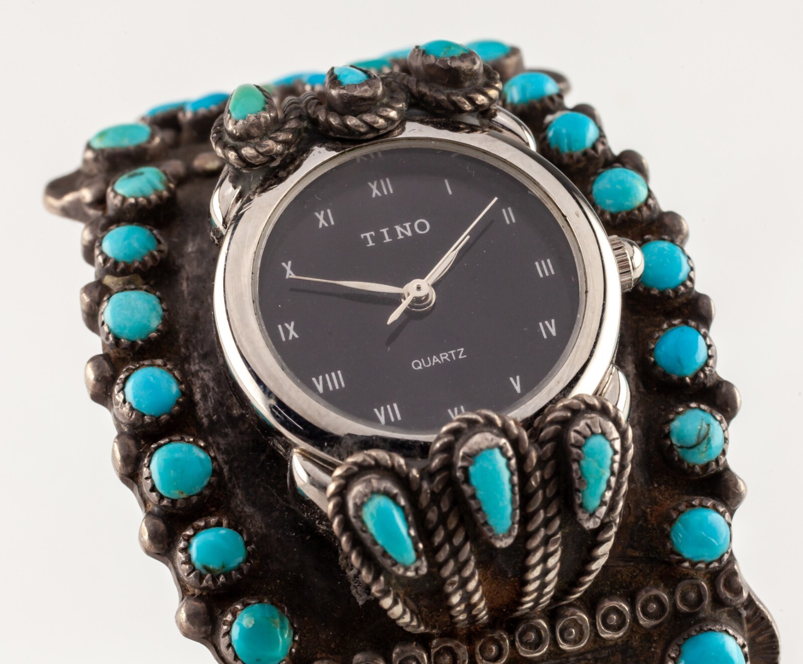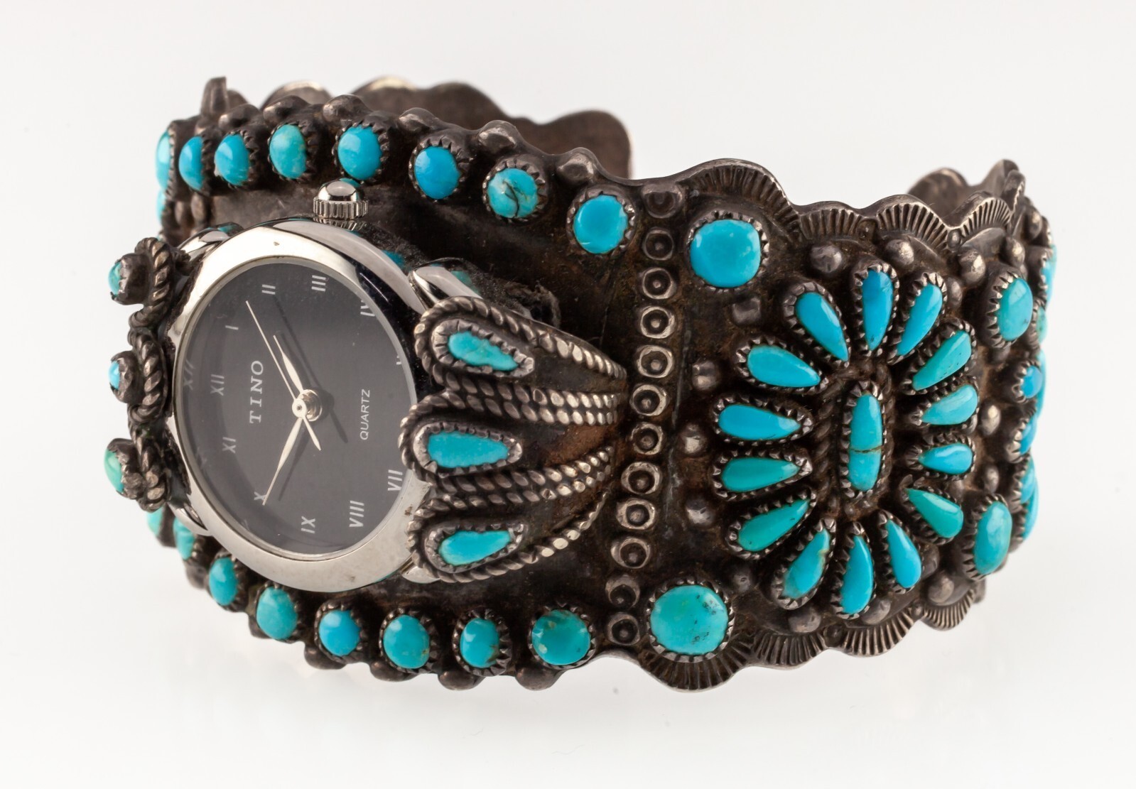 Navajo Needlepoint Cuff Watch by F.M. Begay 38mm Wide 94.8gr Black Dial w/ Silver Hands with Roman Numerals (M + H + S) All shipments include insurance and delivery confirmation or signature confirmation. Local Pick-up is available in our showroom. All international packages will have the required customs declaration and value of order. Your continuing satisfaction is very important to us. We offer a 30 day money back return policy. If you are unhappy with your purchase for any reason, please notify us so that we can begin the returns process. All items for sale are available for viewing at our Southern California showroom. We would like to thank all of our loyal customers for their continued support. If you have any questions, comments or concerns, please click "Ask a question" below,