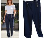 .#1001....Navy blue pants with gold-colored buttons on the front, referred to as "sailor pants" or "mariner pants". style of the pants is a straight or slim leg, with a high waist and a cropped length.....Size L.