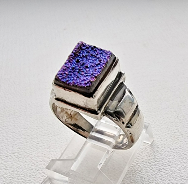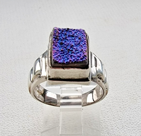 The NB Indian 925 Sterling Silver Blue Titanium Druzy Ring is a vintage piece of fine jewelry signed by the brand. This stunning ring features a rectangular blue druzy stone set in a bezel style on a 4mm band of sterling silver. The unique design and beautiful color make it a perfect choice for those who appreciate beauty in their jewelry. This ethically sourced piece from India is sure to add a touch of elegance to any outfit.