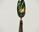 Aqua Ripple luminous resin pendant with a gold tassle dangling below the pendant; mounted in a beautiful gold setting. Swirled ripples as the aqua ocean front, and the movement of the waves. Anyone who is a beach goer, Loves the serenity and calm, a little reminder that this shimmering necklace converys. Please view the photos for details. A Sautoir Gold chain is Included, a 19 inch gold adjustable chain.