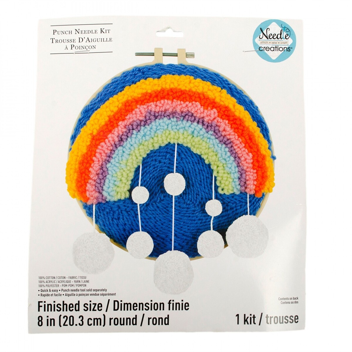 Needle Creations Rainbow 8 Inch Punch Needle Kit. Punch Needle Kit. 100 Percent Cotton Fabric, 100 Percent Acrylic Yarn, and 100 Percent Polyester Pom-Poms. Quick and easy. Kit Includes: 1 Fabric Panel, 8 Yarn Colors, 8 Pom-Poms, 1 Plastic Embroidery Hoop, 1 Needle, and Instructions. For use with a 2.2 mm adjustable punch needle tool for yarn with threader. Sold separately. Kit requires a basic knowledge of punch needle. Finished Size: 8 Inch Diameter. CHK-NC-PNND-RNBPOM