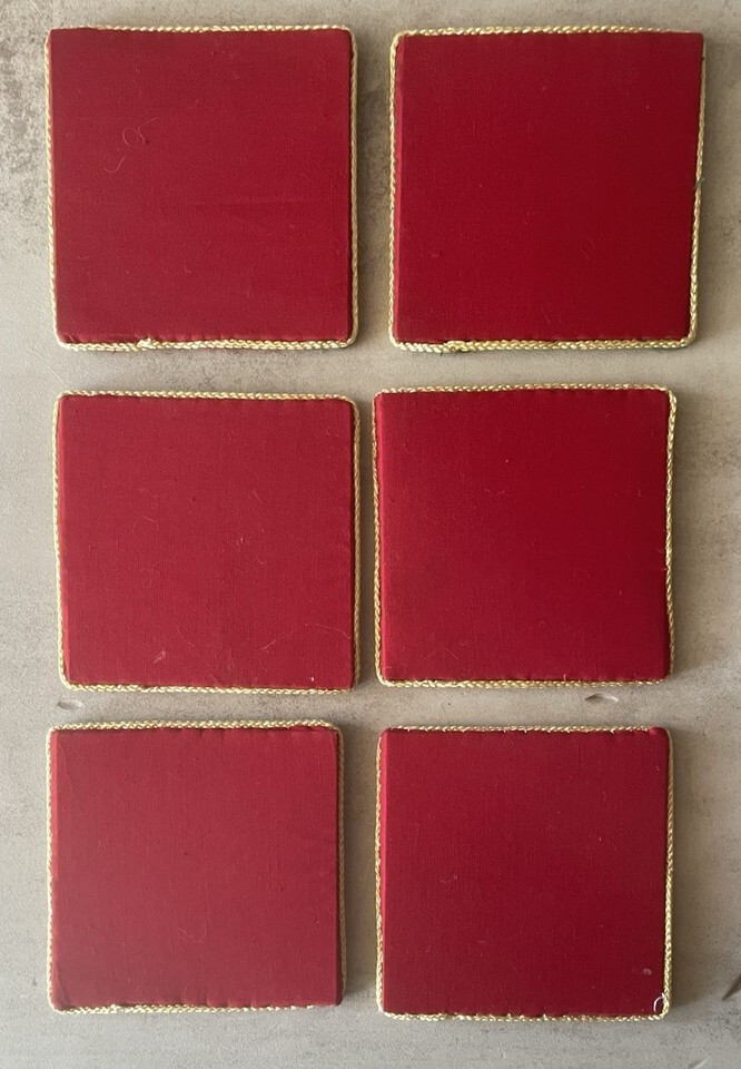 Beautiful set of 6 hand-stitched Christmas needlepoint coasters featuring classic holiday designs: Santa, Angel, Snowman, Christmas Tree, Gift, and Reindeer with a gold braided edge trim. Each piece measures approximately 4 inches square. Ideal for entertaining, holiday decor, or display in tiered trays or table settings.