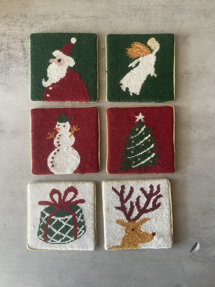 - Needlepoint Christmas Coasters Set of 6 – Santa Tree Angel Reindeer Snowman Gift