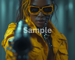 This electrifying portrait captures a fierce cybernetic warrior mid-confrontation, commanding the viewer with an unflinching gaze and a raised weapon. Her vivid yellow jacket and matching futuristic shades contrast sharply with the cool, metallic corridor behind her, creating a bold high-tech aesthetic. A section of her face reveals exposed cyber-mechanics—sleek chrome plating, articulated servos, and glowing circuitry—hinting at the fusion of humanity and machine beneath the surface.
