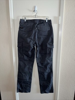 The product is a pair of Ariat Rebar M4 Pants for men in size 32x34, featuring a relaxed fit and straight leg design in a dark gray color. Made from a blend of spandex and cotton, these canvas fabric pants are durable and comfortable for workwear. They have a mid-rise waist with a zip and button closure, as well as cargo and 5-pocket designs for added functionality. The pants also feature a relaxed bootcut style with stretch material for flexibility and ease of movement. Perfect for all seasons, these pants are machine washable for easy care.