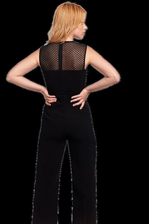 The Brooke Jumpsuit features a round neckline with lace mesh detailing, fitted bodice, statement mesh lace body length piping and back zip entry. This style is lined.
