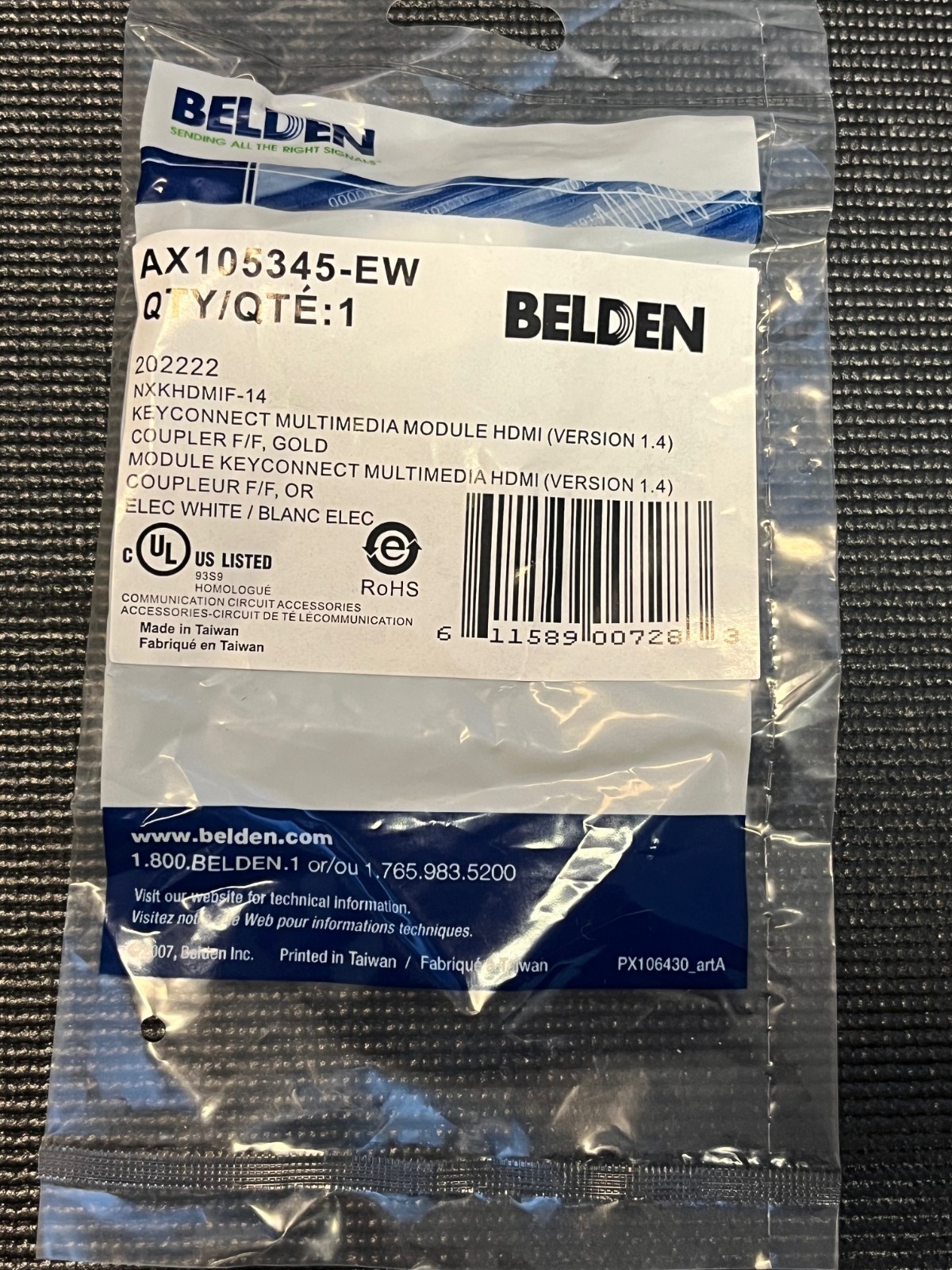 Package Includes: 1x Belden AX105345-EW HDMI Coupler