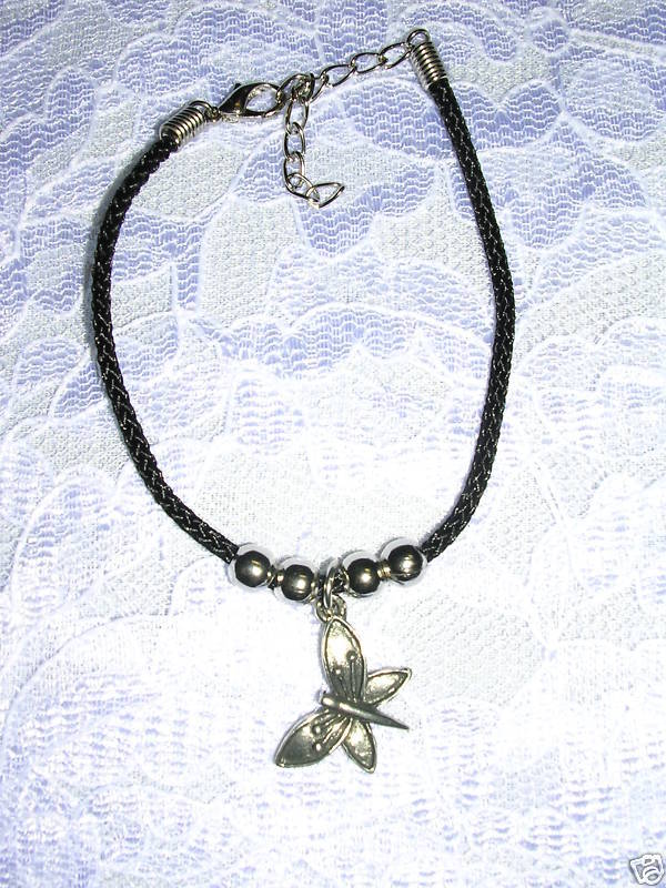 NEW BLACK CORD w PEWTER BUTTERFLY CHARM DANGLE BRACELET