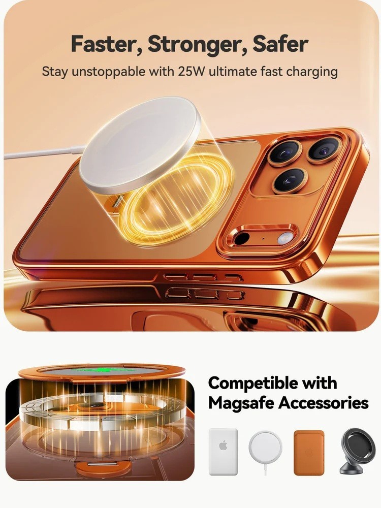 ?Upgraded N58 Magnets Fit With MagSafe?Embedded N58 neodymium permanent magnets and MagPrime patented tech, designed for Apple 17 Pro Case ensures 4x stronger magnetism and 25W fast wireless charging.
