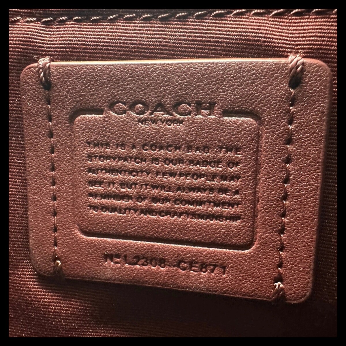 ** Interior is fully lined in a Burgundy Brown Material with Slip Pocket with "Coach" Leather Creed