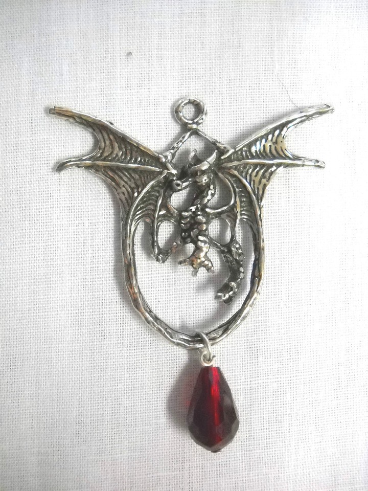 ANTIQUED LOOK WINGED FLYING DRAGON WITH A BLOOD RED CRYSTAL DROP SHAPED DANGLING UNDERNEATH