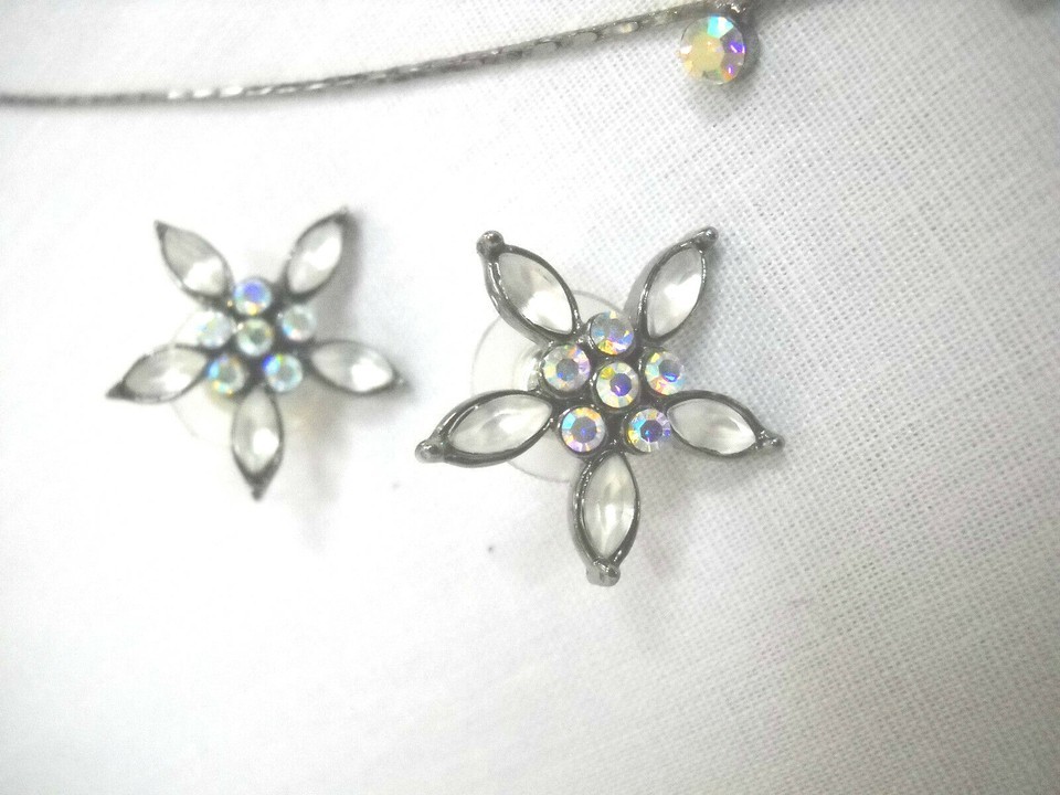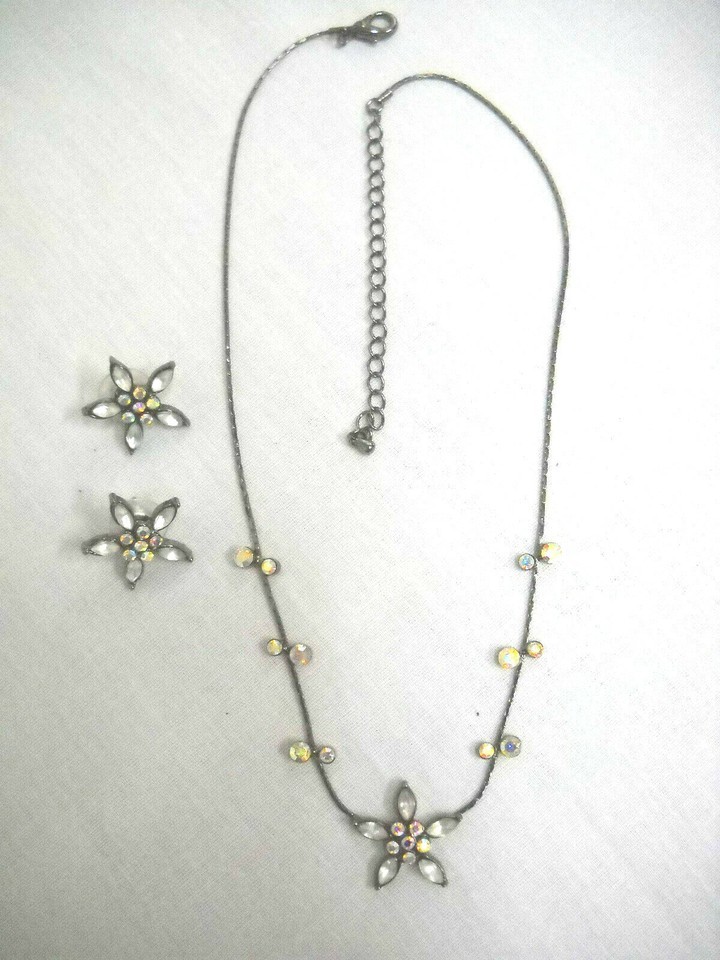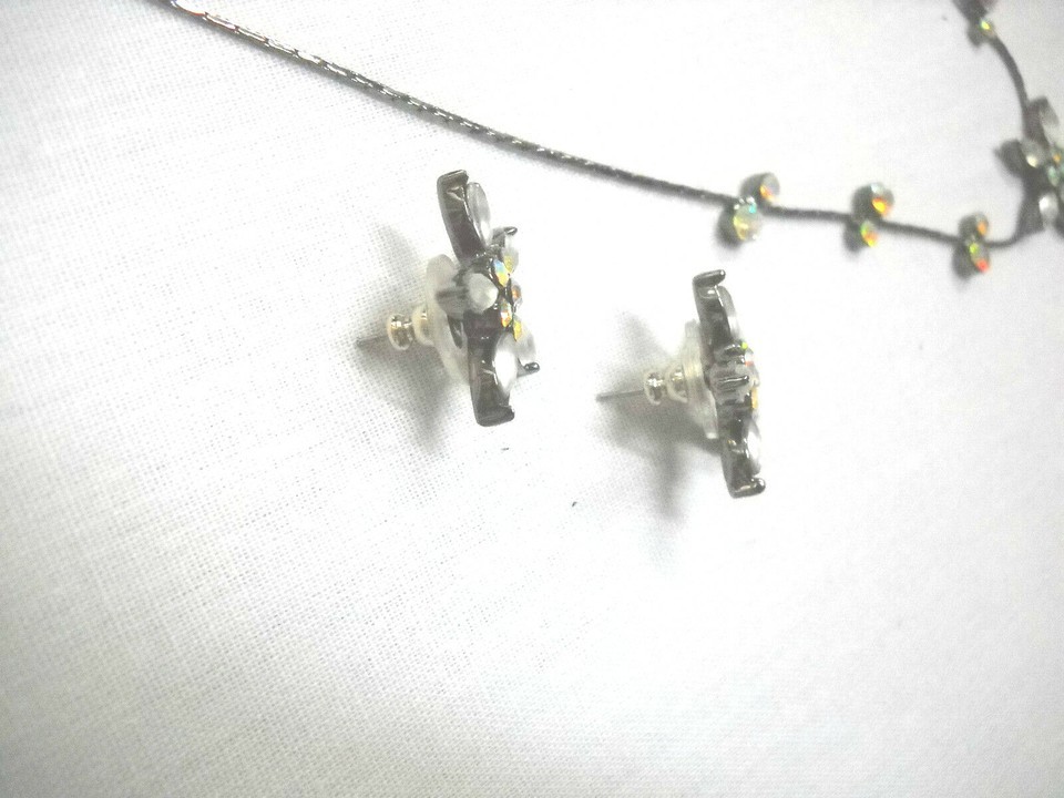 BLACK CHROME PLATED NECKLACE EARRINGS SET - CHAIN AND SETTINGS WITH COLORFUL IRIDESCENT CLEAR WHITE RHINESTONES or CRYSTALS IN A FLOWER BURST FASHION DESIGN