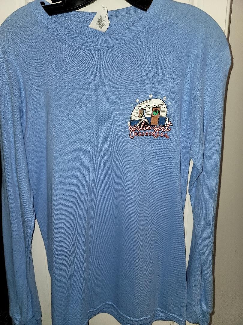 The New Girlie Girl Camping Christmas Long Sleeve T-Shirt is a cozy and festive top perfect for the holiday season. Made from 100% cotton, this pullover shirt features a crew neckline and short sleeves, making it ideal for casual wear. The blue color and graphic Christmas theme add a touch of fun and cheer to your wardrobe. Machine washable for easy care, this regular fit tee is a stylish choice for women looking to spread holiday joy.