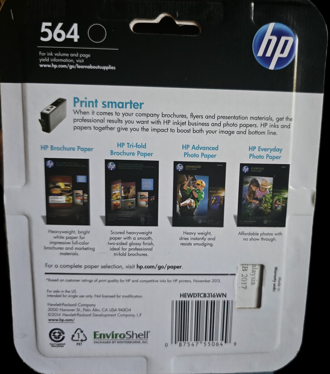Ensure crisp, smudge-resistant professional quality text with this OEM genuine HP 564 Black Ink Cartridge. It's a perfect fit for your HP inkjet printer, providing consistent, reliable performance and a sharp black color every time you print. The cartridge is manufactured in Malaysia, assuring you of its quality and authenticity.
