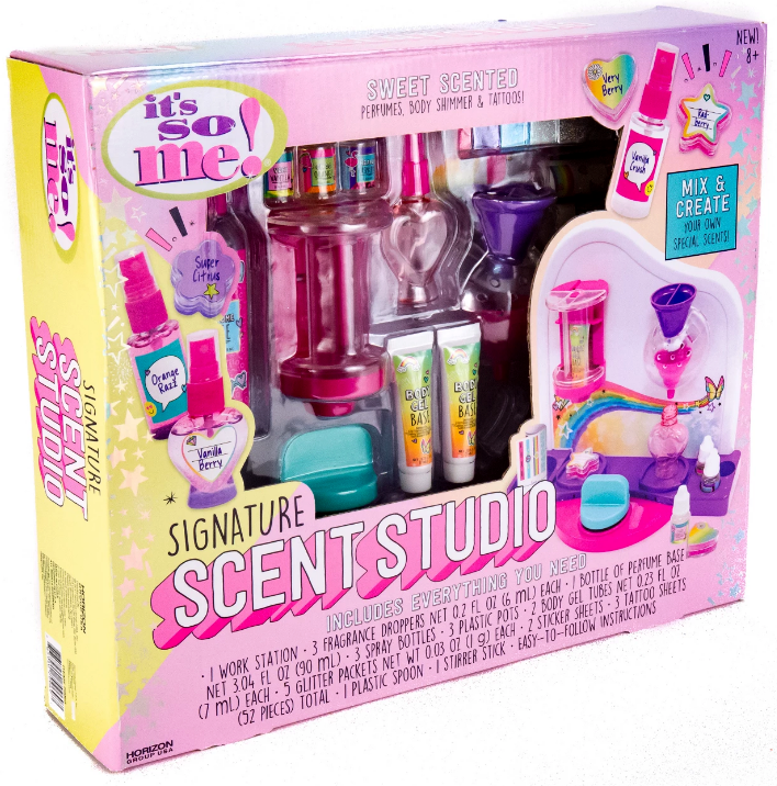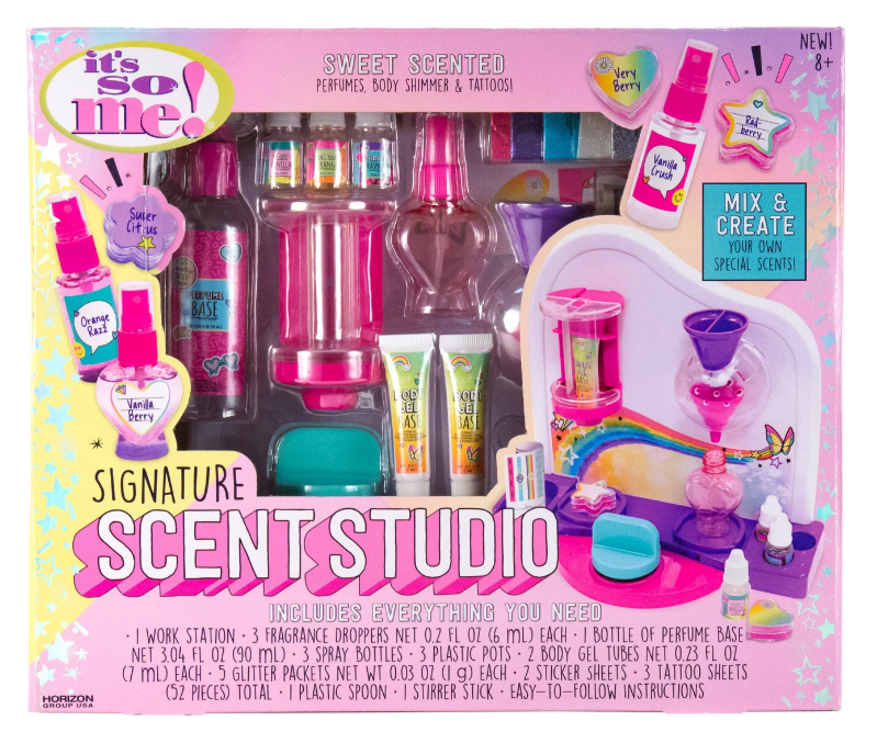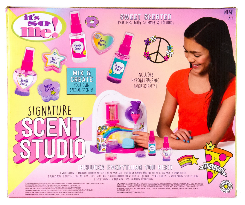 This is for a Brand New in Box It's So Me Signature Scent Studio 1 Work Station 3 Fragrance Droppers 1 Bottle of Perfume Base 3 Spray Bottles 3 Plastic Pots 2 Body Gel Tubes 5 Glitter Packets 2 Sticker Sheets 3 Tattoo Sheets 1 Plastic Spoon 1 Stirrer Stick Easy to Follow Instructions!!! Standard FedEx Smart Post only Available For The Continental USA. Alaska, PR, Etc. Use Priority Mail Option.