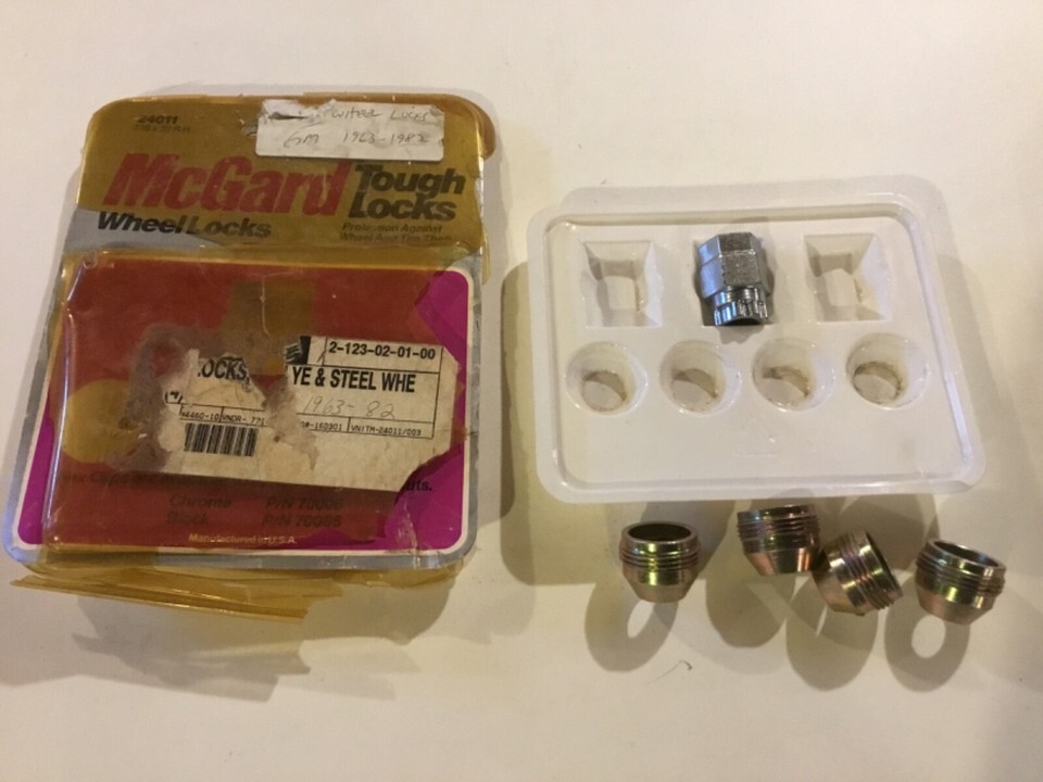 Up for sale is a new set of 4 McGuard wheel lock lug nuts with key. These are listed for use on Corvettes with steel wheels or rallye wheels. Not aluminum wheels. The with fit other Chevys with the same stud threads. The part number is 17511, so check your application. I have had these sitting on my shelf for a long time and the packaging show it. These are brand new and never installed. Please contact me with any questions. Thank you.