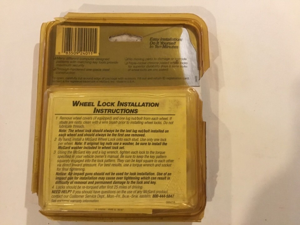 Up for sale is a new set of 4 McGuard wheel lock lug nuts with key. These are listed for use on Corvettes with steel wheels or rallye wheels. Not aluminum wheels. They will fit other Chevys with the same stud threads. The part number is 17511, so check your application. I have had these sitting on my shelf for a long time and the packaging show it. This was never opened and the last two pictures are from another set I am selling, so you can see what they look like. These are brand new and never installed. Please contact me with any questions. Thank you.
