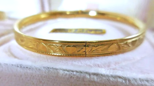 Darling little gold-filled hinged bangle bracelet with little hearts and leaves all the way around. The inside of the bangle is curved and shiny. Since the inside is blank you could take it to a jeweler to have it engraved with the baby's birth or Christening date. This little bracelet is new, old stock and never worn. Marked 14K gold filled and has the makers mark of TK for Tru-Kay Jewelry Co. Made slightly oval for baby's comfort. It comes inside of its original 1970's velvet covered box and was distributed by Karat Kids. It has a 1-1/2" x 1-1/2" inside, across measurement with a 5" circumference. There are actually 2 of these available, exactly the same so could be for twins, these would be perfect. One box still has the original price label of $50.00 back in the day. A beautiful way to create a memorable heirloom for baby.