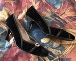 Up for bid is a pair of new never worn, vintage stiletto pumps Size 10 by Highlights. They are black velvet with satin trim. On the round toe is satin trim with a dainty oval pearl buckle trim.