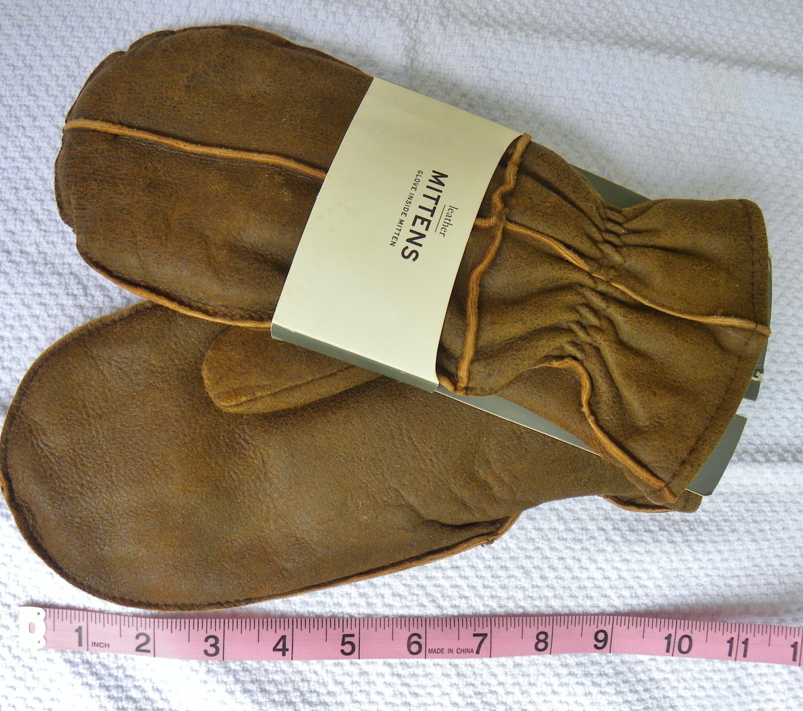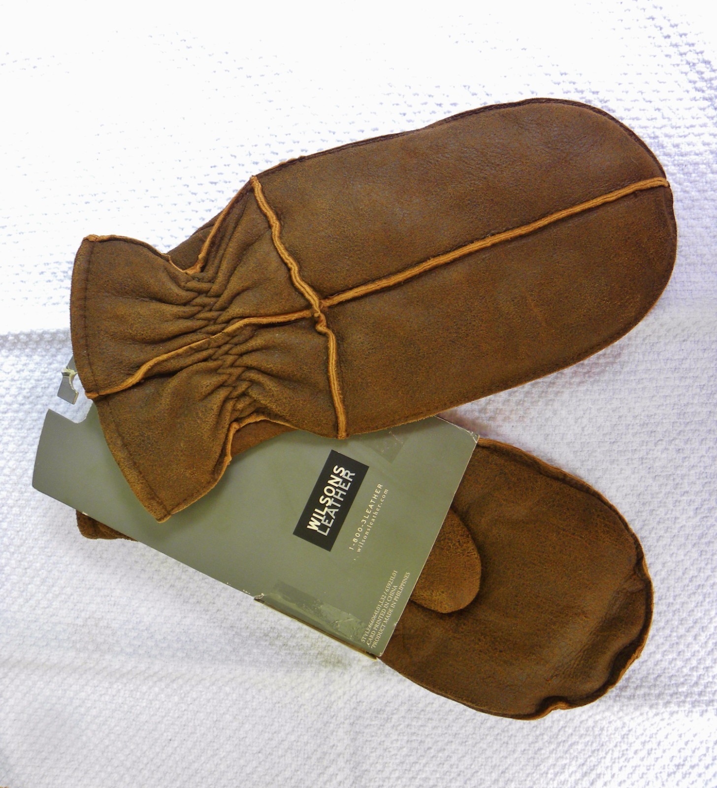 For sale: New with Tags "Wilson Leather" Brown nubuc Leather Mittens size Large. Winter mittens with elastic wrist on one side, soft cozey poly fleece lining with separated fingers. Length: 10.25--Width 4 5/8". Nice gift. Thanks for looking!