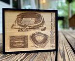 Product description: Transform your space with this meticulously detailed laser-engraved blueprint of the iconic Stadium in Bronx, New York. This stunning 14"x11" wall hanging features three distinct architectural views of the legendary ballpark - an aerial perspective, interior view, and seating diagram. The piece is beautifully engraved on wood, creating a sophisticated sepia-toned finish that adds depth and character to the intricate architectural details. Perfect for baseball enthusiasts, sports memorabilia collectors, or anyone who appreciates architectural artistry, this piece includes fascinating stadium specifications and seating information. The black frame provides a sleek, contemporary finish that will complement any home, office, or fan cave. Each engraving captures the grandeur of this historic venue, from its distinctive facade to its precise dimensional layout, making it both a conversation piece and a tribute to America's favorite pastime.